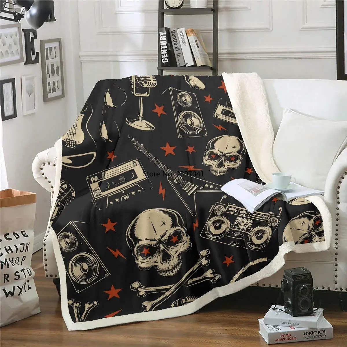 Магнитная лента, декоративное одеяло в стиле ретро, с изображением сахарного черепа, перекрестных костей, музыки, гитары, динамика, записи, панк, Флисовое одеяло