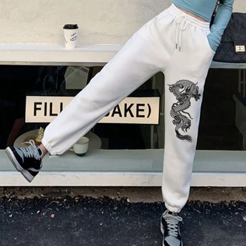 Пикантные брюки с высокой талией, свободные, с карманом, флисовые тренировочные штаны, зимние, белые, мешковатые, с принтом дракона, зауженные, женские брюки, 2021