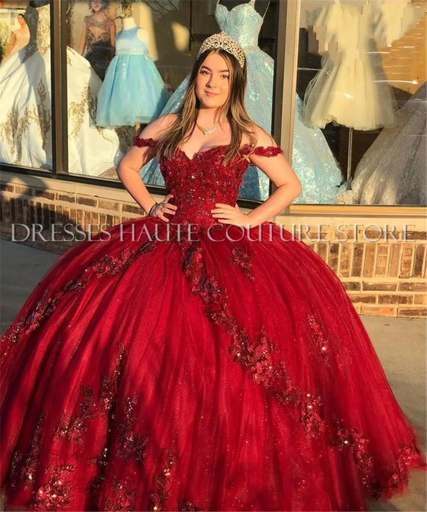 Vestidos De 15, с красным кружевом Бальные платья с кружевной аппликацией сладкий 16 платье с открытыми плечами и мексиканская Выходные туфли на выпускной бал