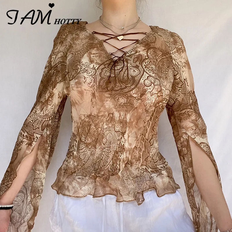 Осенне-весенняя женская Сетчатая футболка Y2K с винтажным принтом, ...