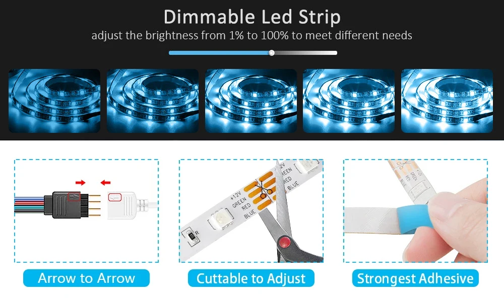 Название: лента RGB BluetoothСветильник Цвет: разноцветный "Красный-зелёный-желтыйДлина ленты: 5 м/10 м/15 м/20 м/25 м/30 мСветодиодный код чипов: 5050 SMDFPC ширина: 5050-10 ммРабочее напряжение: DC12VИсточник питания: штепсельная вилка стандарта США (110 В)/штепсельная вилка европейского стандарта (220 В)/штепсельная вилка стандарта Великобритании (230 В)/штепсельная вилка стандарта Австралии (240 В)Уровень водонепроницаемости: IP65 (водонепроницаемый) / IP20 (не водонепроницаемый)Угол луча: 120 °Срок службы: 50000 часовРабочая температура: -20 ° ~ 60 °Метод управления: Bluetooth APP или IR 24Key дистанционное управлениеПульт дистанционного управления: 1 шт. CR2025/CR2032 (не входит в комплект)Функции: таймер/Управление группой/DIY цвета