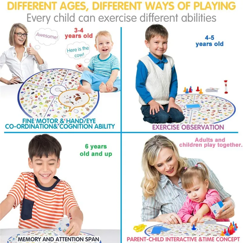 Описание товараПодходящий возраст: 4 года и вышеМатериал: картон, пластикКоличество игроков: 2 или болееХарактеристика:1. После правильного написания большой игровой доски вам нужно быстро найти три картинки с подсказками в песочные часы в соответствии с тремя подсказками на карточке ключа. Когда вы ищете картинку, вы должны покрыть ее игровым индикатором. После покрытия игрового индикатора, вы можете получить рингтон игры. В определенное время матча нам нужно увидеть, кто получает наиболее подходящие кольца и выиграет матч.2. Это требует не только острых глаз, но и спокойной головы.Примечания:1. Из-за ручного измерения допускается небольшая разница.2. Из-за различных дисплеев и разных огней изображение может не отображать фактический цвет изделия. Спасибо за понимание.Чтобы позволить покупателям получить более выгодные цены, у нас обычно нет оригинальных цветных коробок, мы упаковываем их в полиэтиленовые или пузырчатые пакеты для хорошей защиты. Если вам нужна коробка, пожалуйста, свяжитесь с нашим персоналом.