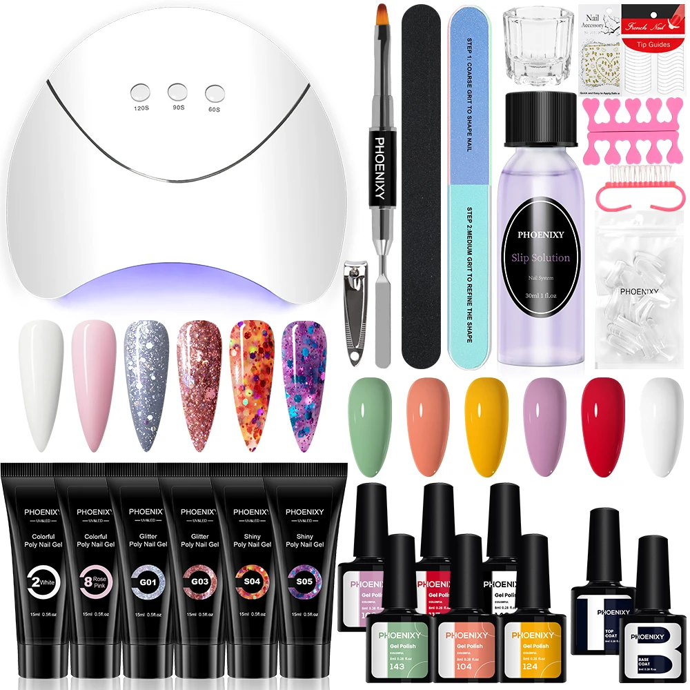 1X36W УФ светодиодный светильник1 базовое пальто 8 мл1 х 8 мл верхнее пальто6X8 мл гель для ногтей6X15 мл полигель для ногтей1 X пакет из 50 шт. наконечников для наращивания ногтейСтеклянная чашка-1 шт.1 х металлическая наклейка для ногтей1X2 в 1 наклейка для ногтей для французского маникюра1X1 пара разделителей пальцев1 X щетка для ногтей1X30 мл удлинитель жидкости1 X машинка для стрижки ногтей1 х черный пилка для ногтей1X7 сторонний пилка для ногтей1 X Двухсторонняя щетка для ногтей