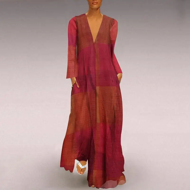 Женское платье-макси в клетку, с длинным рукавом и V-образным вырезом