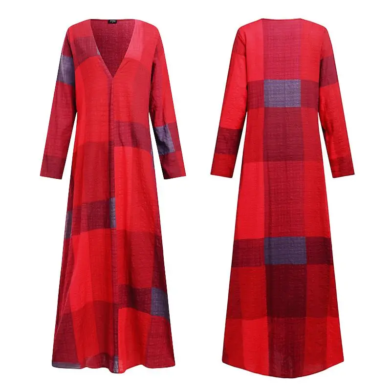 Платье VONDA женское с длинным рукавом, пикантный пляжный сарафан в клетку, с принтом в стиле пэчворк, с глубоким V-образным вырезом, кафтан, халат, на лето