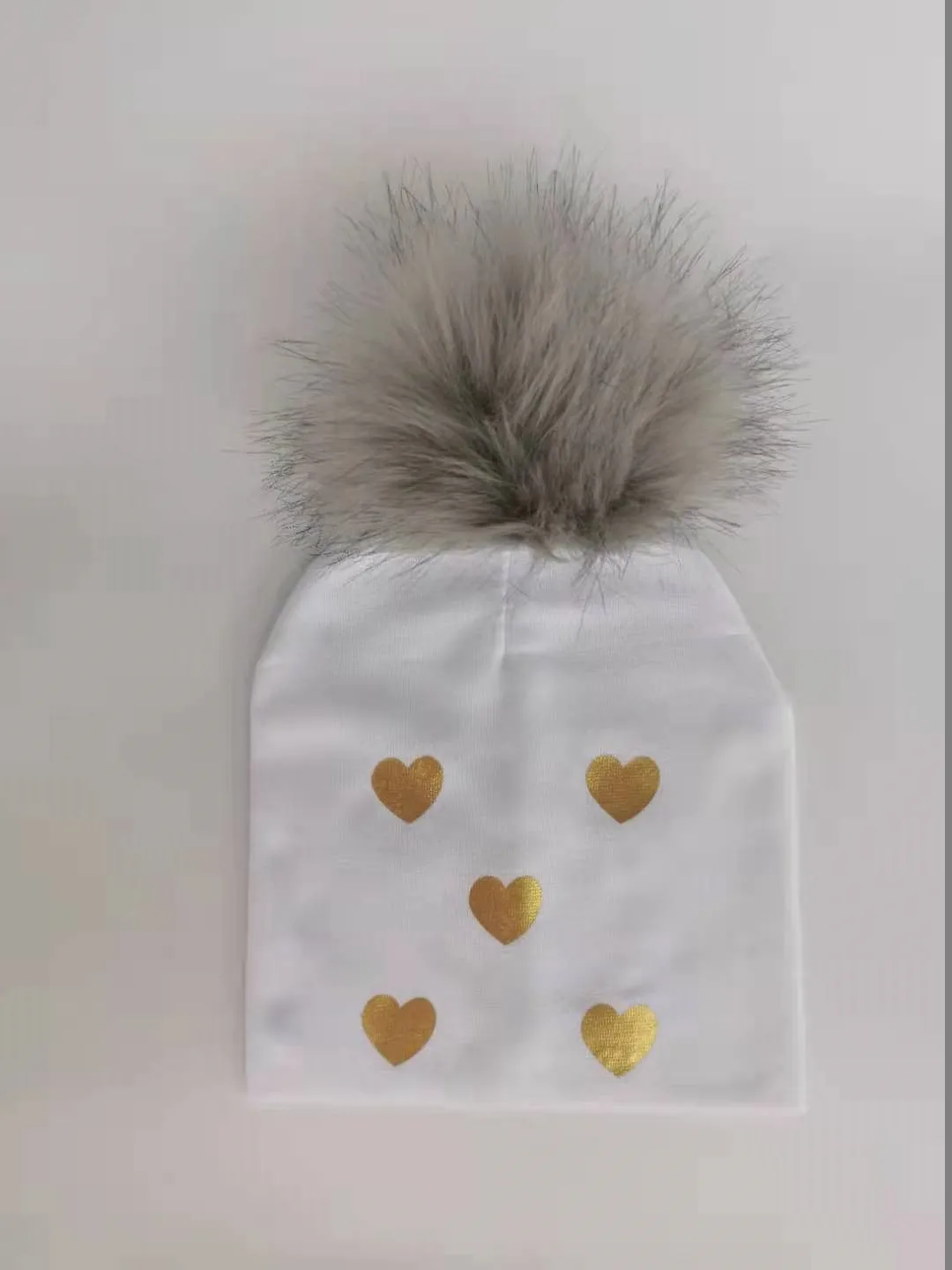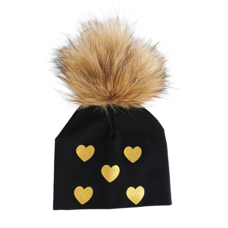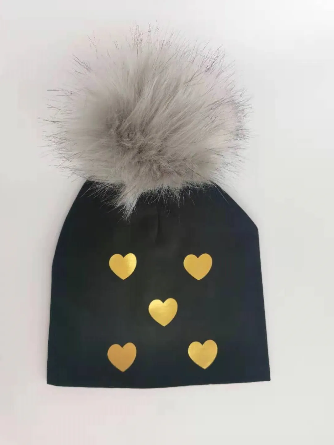 Брендовая одежда для новорожденных детей, для маленьких мальчиков и девочек Теплые Зимние Золотой Милый хлопковый топ с аппликацией в форме сердца, шапка Помпон из искусственного меха с помпоном-кисточкой шапка зимняя теплая шапка