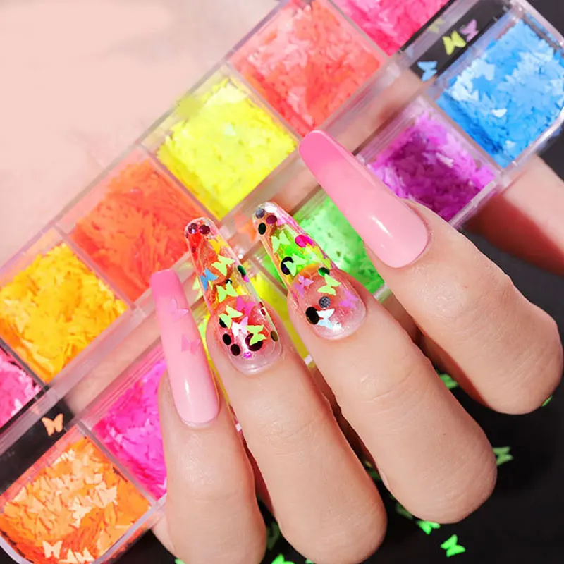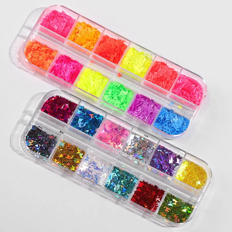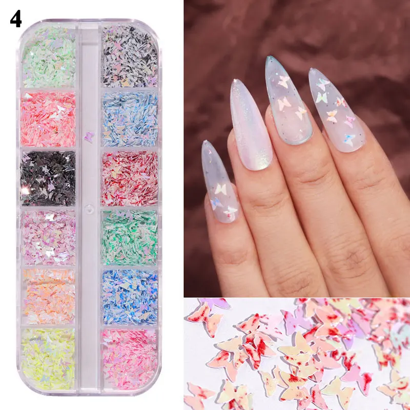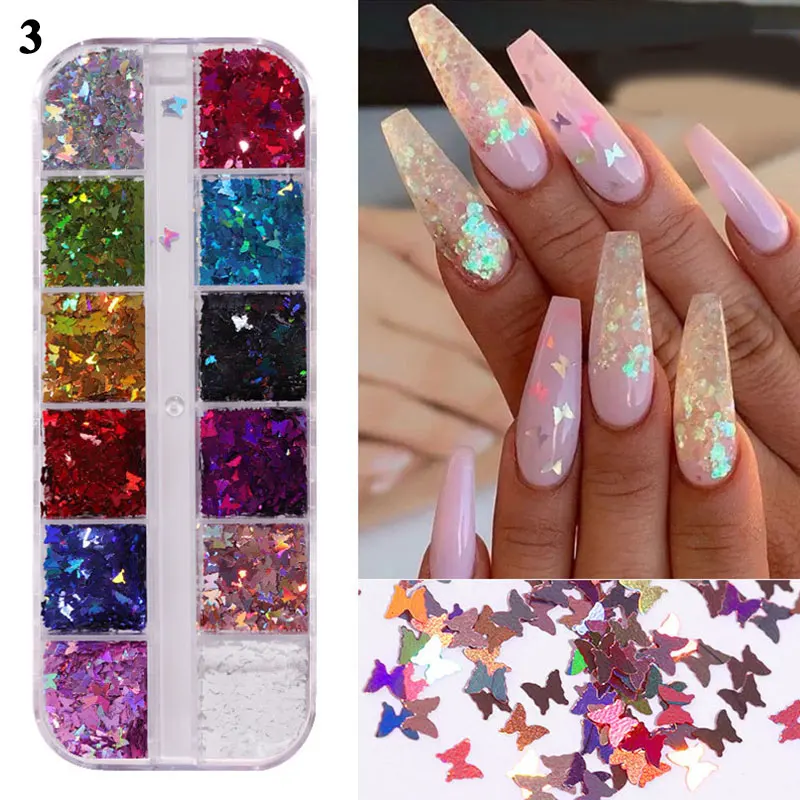 12 цветов в упаковке, 3D лазерная голографическая бабочка, блестки для ногтей, флуоресцентная блестящая фольга, макияж, инструмент для маникюра, хлопья для дизайна ногтей