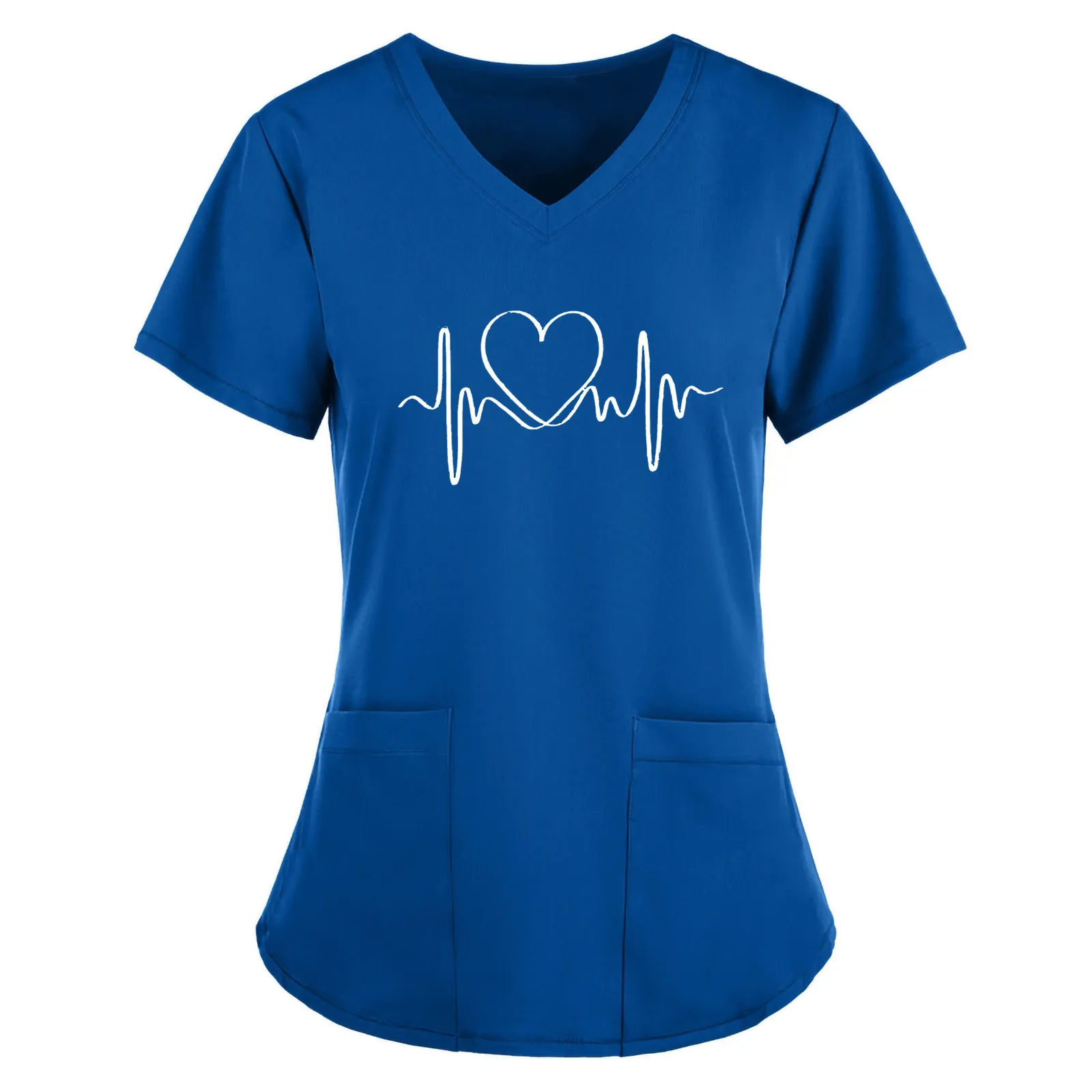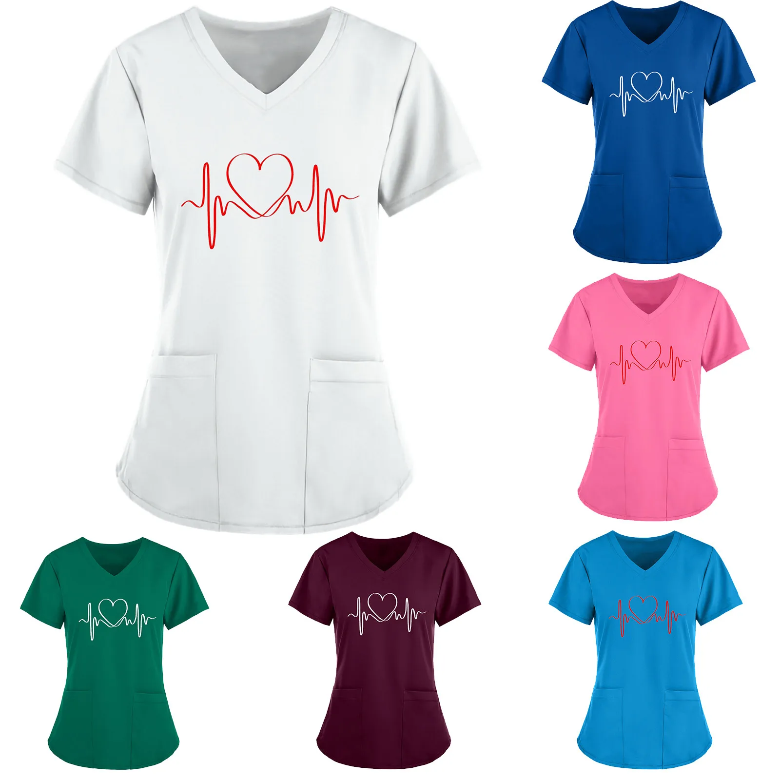 Женская Клиническая форма с принтом Love, с коротким рукавом, одежда для кормящих, летняя, с V-образным вырезом и карманами, рабочая, Повседневная медицинская форма, топы для медсестер