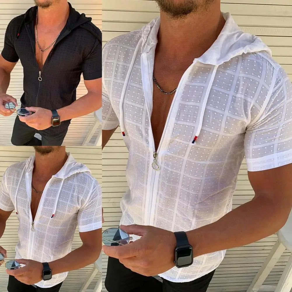 Мужская рубашка с коротким рукавом, с отложным воротником и капюшоном