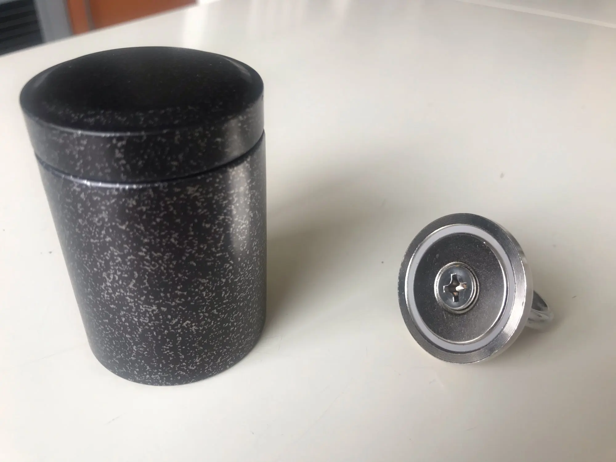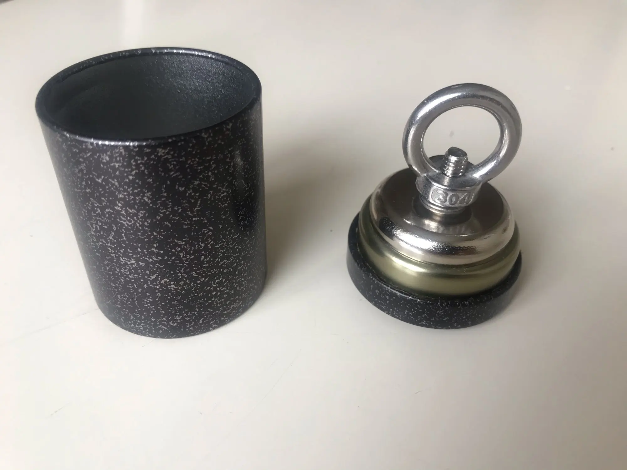 Магнит довольно сильный, лит вую банку с жестяной крышкой поднимает спокойно. Прячется в немагнитную баночку.