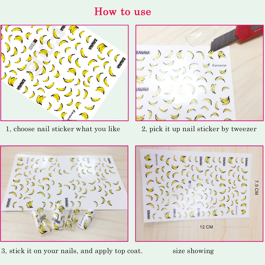 Типы: 3D клейкие наклейки для ногтейСтили: новые милые DIY летние наклейки для дизайна ногтейКомплектация:1 шт 3D наклейки для ногтейИнструкции по использованию:1. Нанесите цвет фона по желанию и дайте высохнуть.2. Осторожно Возьмите наклейку с помощью пинцета.3. Поместите наклейку на Кончики ногтей4. Для лучшего и длительного эффекта Нанесите слой покрытия для ногтей.