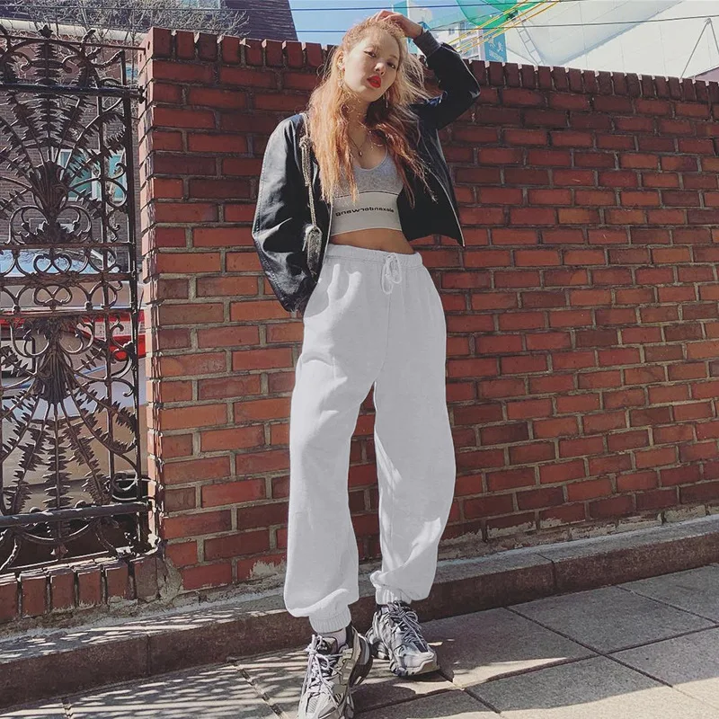 2021 Новые однотонные свободные женские спортивные брюки на шнуровке с высокой талией, трендовые женские укороченные брюки для бега, свободные брюки-трубы