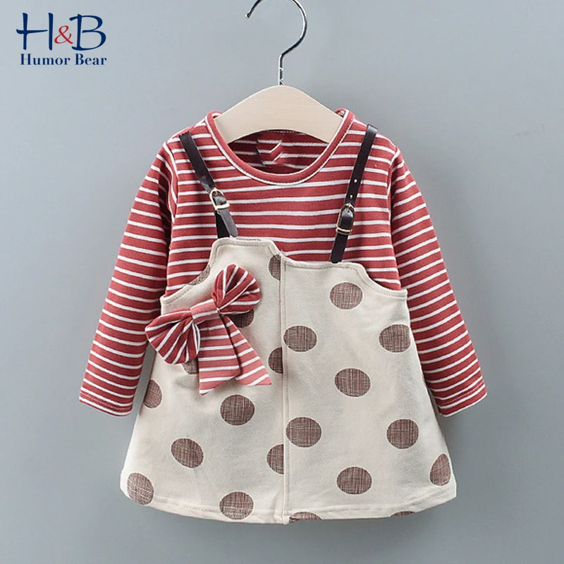 Осеннее платье Humor Bear для новорожденных, новинка, платье с длинным рукавом для девочек, платье в полоску в горошек с имитацией двух частей и бантом для малышей, детское платье