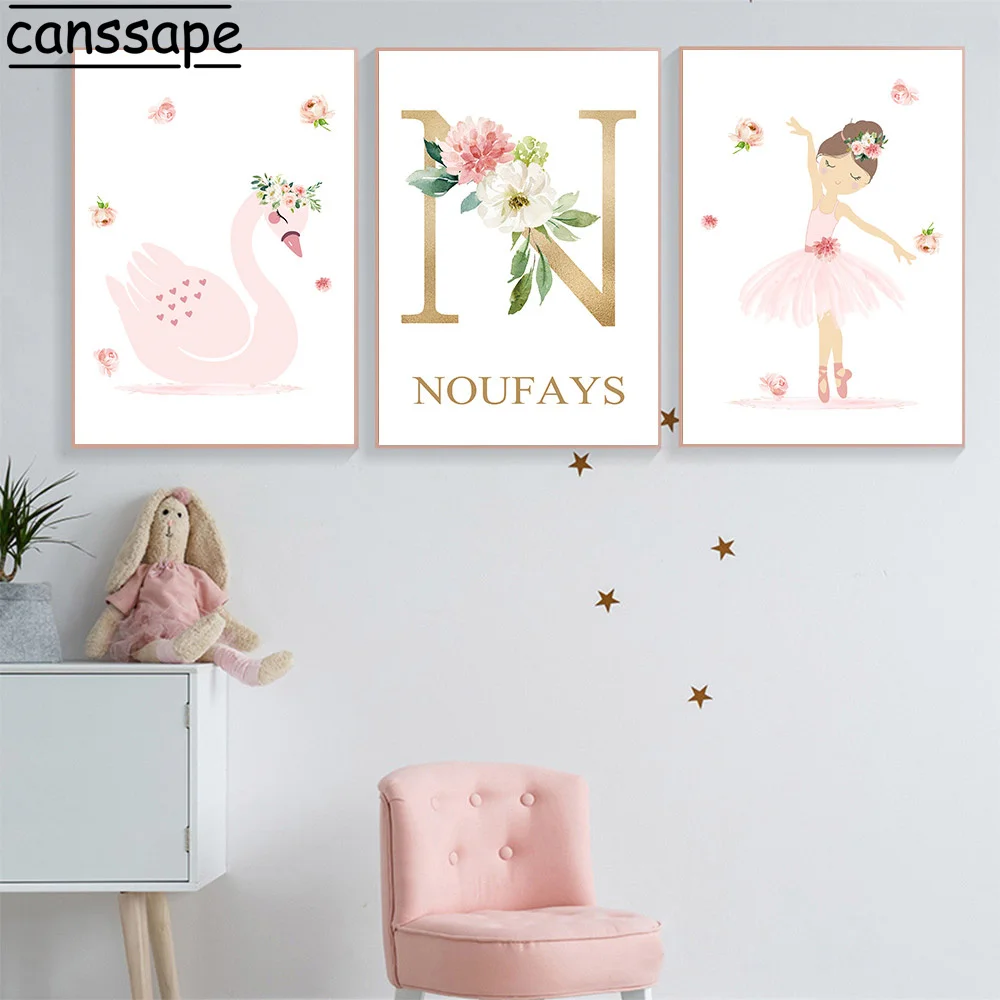 Холст со скандинавскими мотивами плакат рисунком лебедя для маленькой балерины картина пользовательское имя Wall Art печати настенные картины для детской комнаты для маленьких девочек украшение комнаты