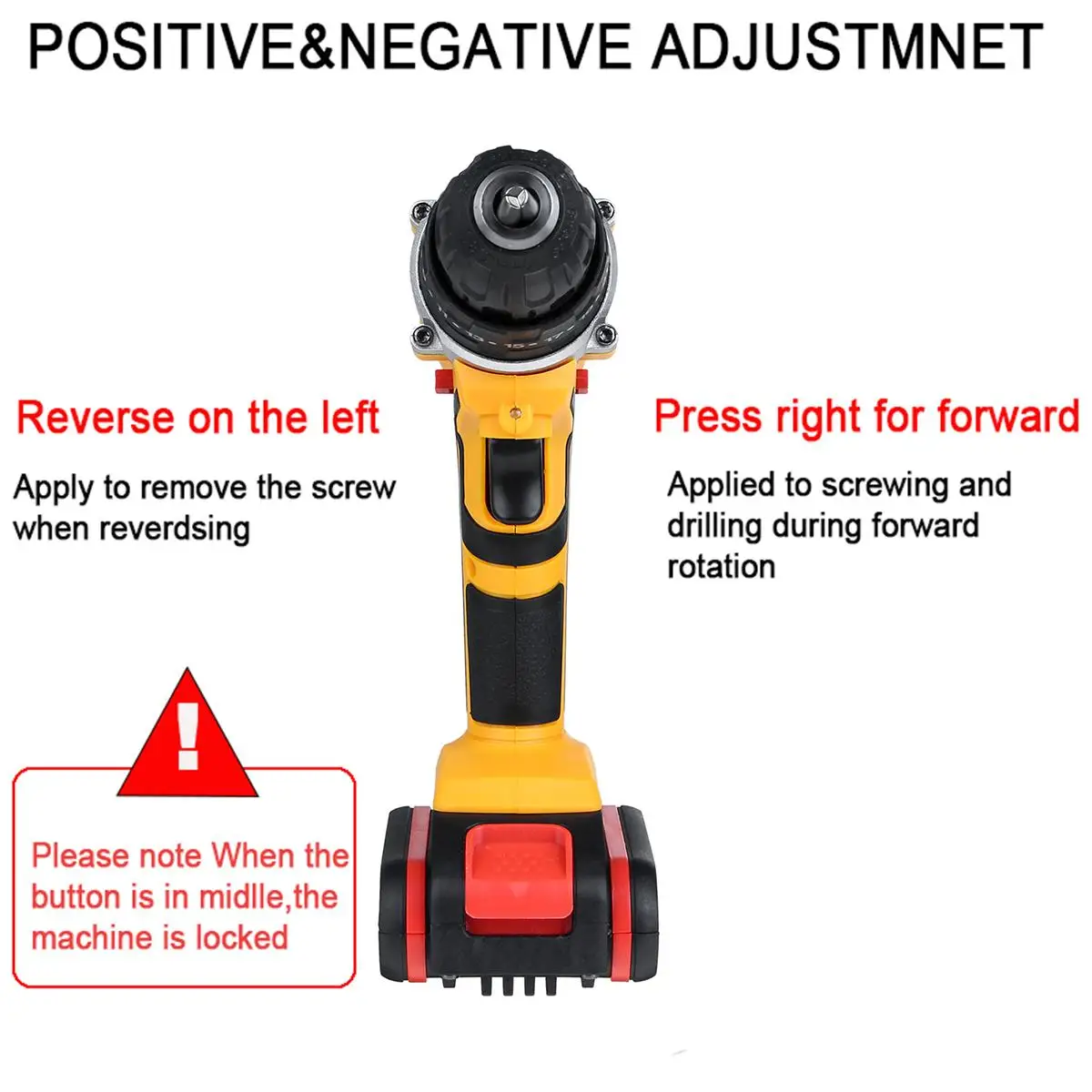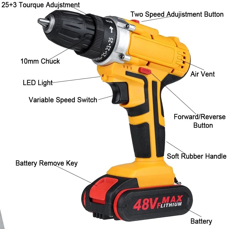 Спецификация Наименование: электрическая дрель Напряжение батареи: 48 В Максимальный крутящий момент: 25-32 нм Скорость без нагрузки: 0-1350р/мин Вход: 110-240 в 50-60 Гц Выход: 80 Вт/1.3A Характеристика -Питание от литий-ионной аккумуляторной батареи, обеспечивая более длительное время работы и большую мощность -Высокоэффективный двигатель, может обеспечить до 32N.m крутящий момент и 0-1350r/мин скорость -Сверлильный патрон может быстро и легко заменить сверло -Применение вперед/обратный переключатель для регулировки 25 крутящего момента -Переключатель вперед/назад может быть установлен в трех положениях: Вперед, перемотка и блокировка. Из-за запорного механизма переключатель вперед/назад можно регулировать только без нажатия на спусковой механизм. Перед использованием переключателя вперед/назад убедитесь, что двигатель полностью остановлен. -С светодиодный светильник, он может обеспечить светильник в темноте во время работы Эргономичный и удобный захват обеспечивает идеальный баланс и контроль инструмента -С 3-я ступенями окружающая Обстановка: Ударная дрель, плоское сверло и поворачивая винт Примечание Двухскоростная посылка без функции удара Кавитация Чтобы уменьшить риск травм, пожалуйста, носите шлем или очки с боковыми щитами. Посылка включает в себя: 1 * Электрическая дрель 1 * Адаптер питания 1 * голый металл 1 * Аккумулятор 2 * Батарея (опционально)