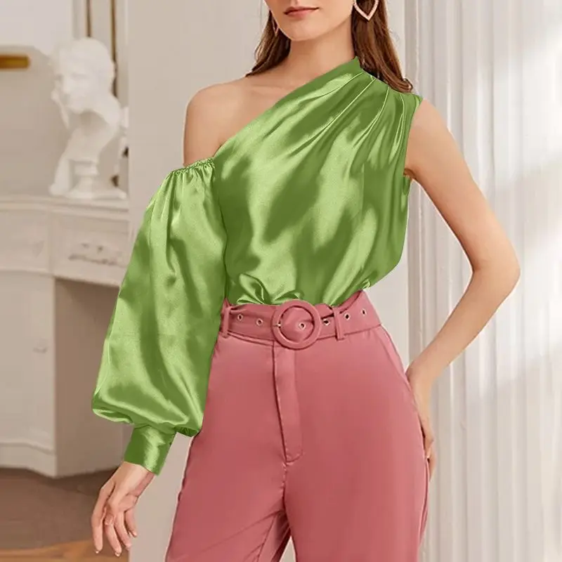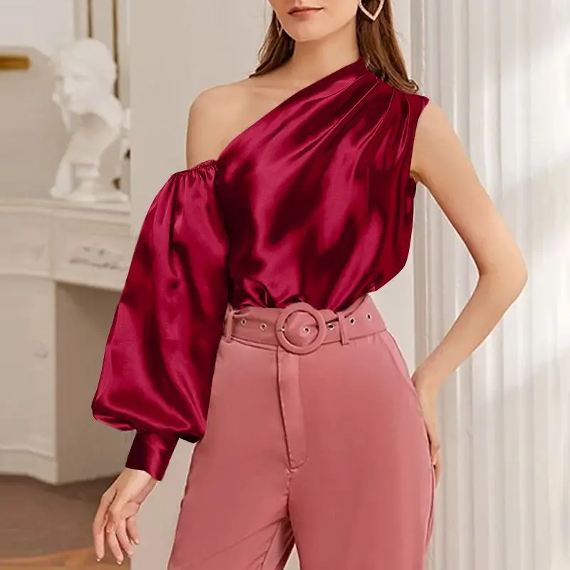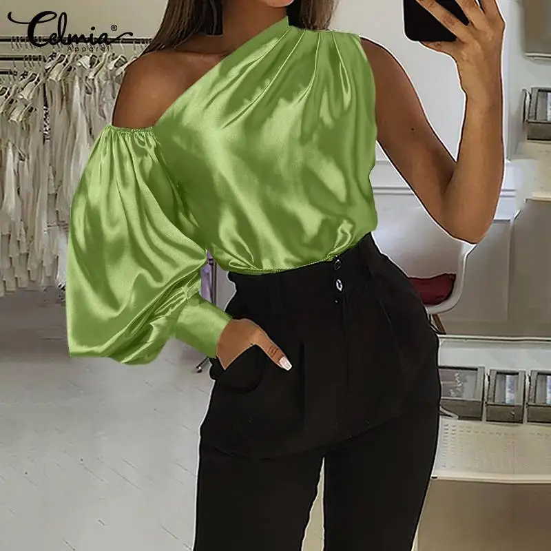 Блузка Celmia Женская атласная на одно плечо, повседневный Модный глянцевый топ с рукавами-фонариками, асимметричная уличная одежда, 2022