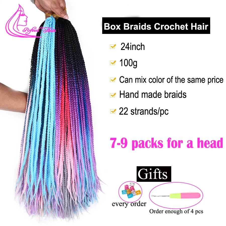 24 дюйма маленькая коробка косы волосы на крючке, Радужный Омбре цвет нежно-фиолетовый, синий, розовый синтетический плетение волос для наращивания 22 прядиПК