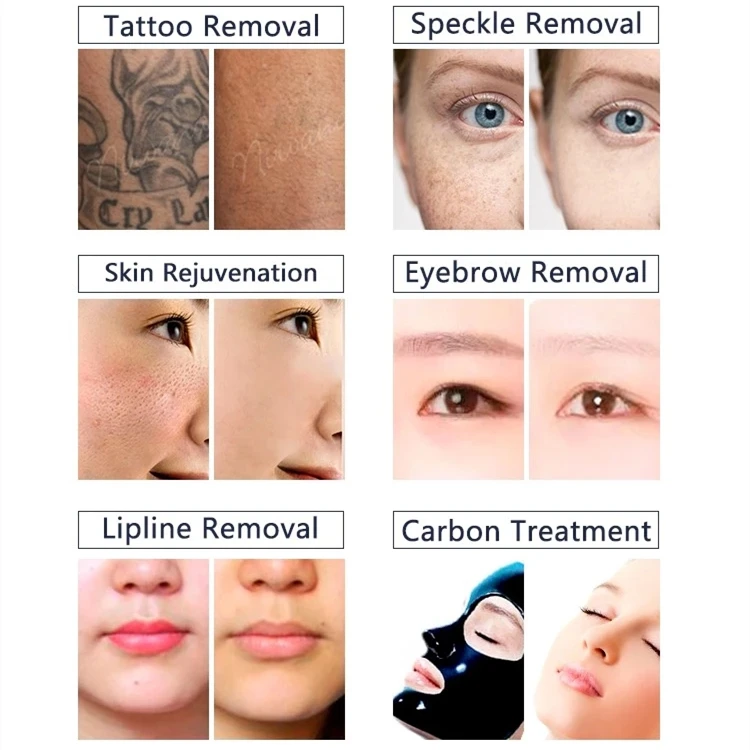 Удаление татуировки (все цвета татуировки, eyeline и липлин удаления)Пигмент эпидермиса и дермы (удаление пигментированных повреждений, кофейных пятен, сениловых пластин, веснушек, пятен от солнечных ожогов и хлоазмы)Лечение шрамов от акне, невус от ОТА, голубой наевс, черный невусОтбеливание кожи и удаление морщин и т. д.