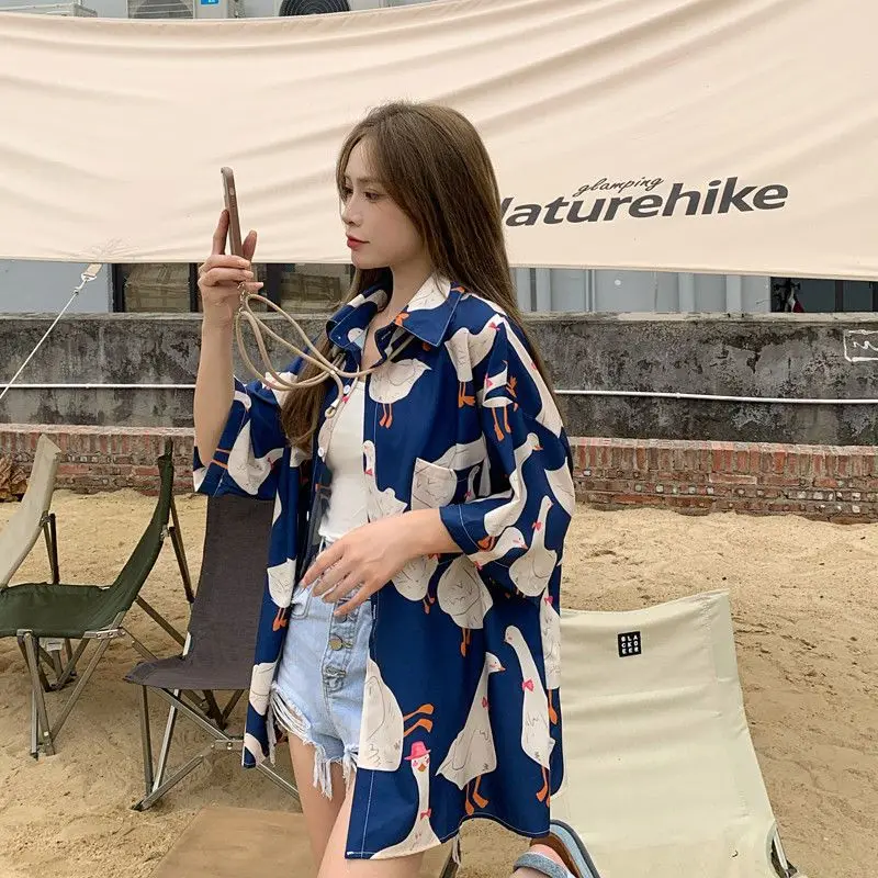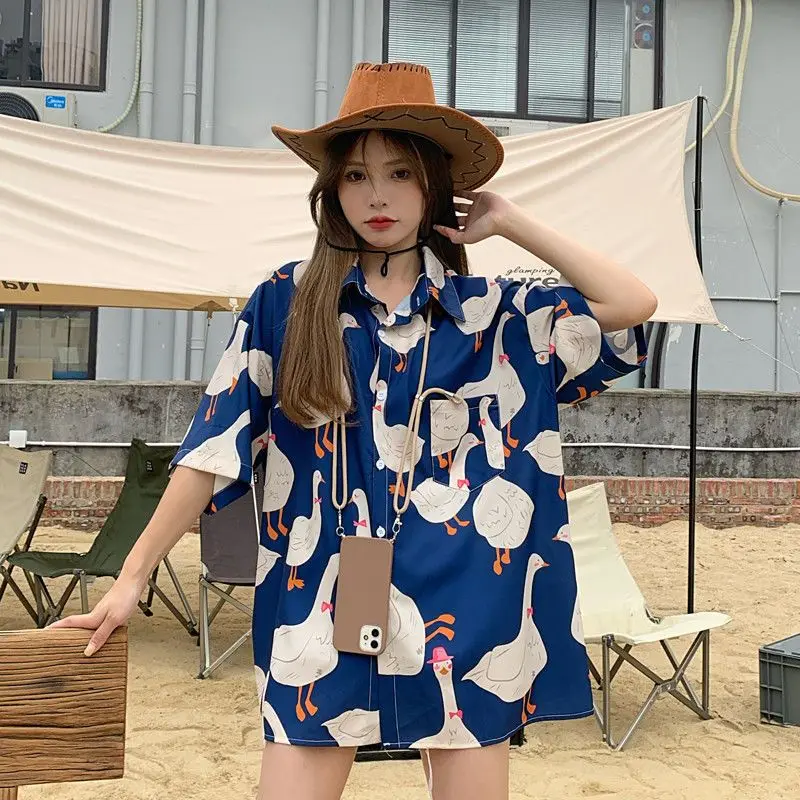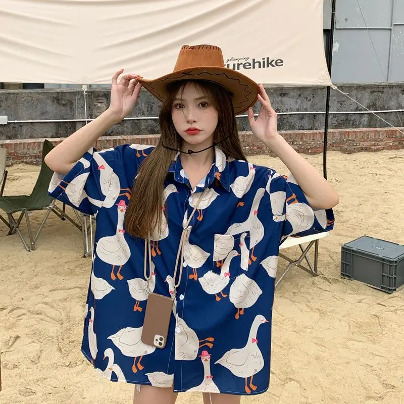 Женская рубашка в стиле ретро, рубашка с коротким рукавом и принтом утки, с масляным принтом, модный тонкий Топ большого размера в Корейском стиле, Новинка лета 2021