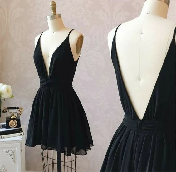 Пикантные короткие черные платья для встречи выпускников с двойным V-образным вырезом, шифоновое Плиссированное Платье До Колена с открытой спиной, женское платье для вечеринки