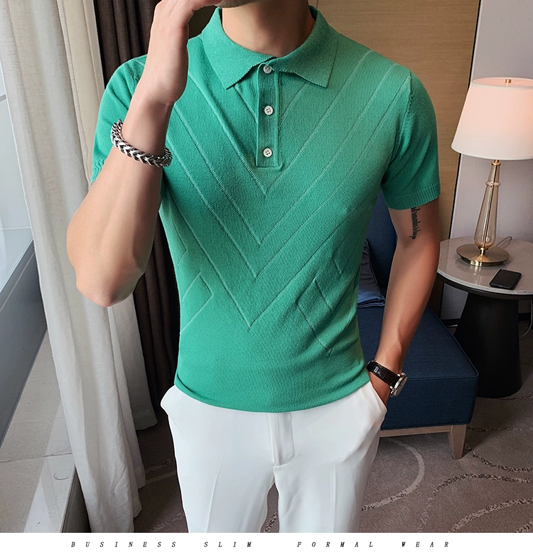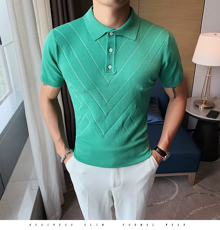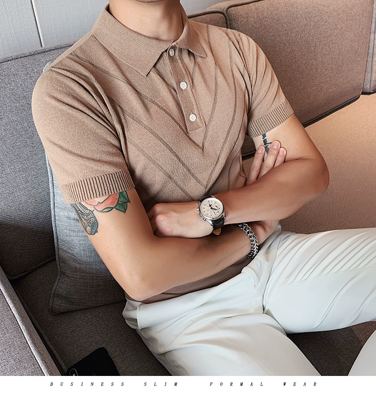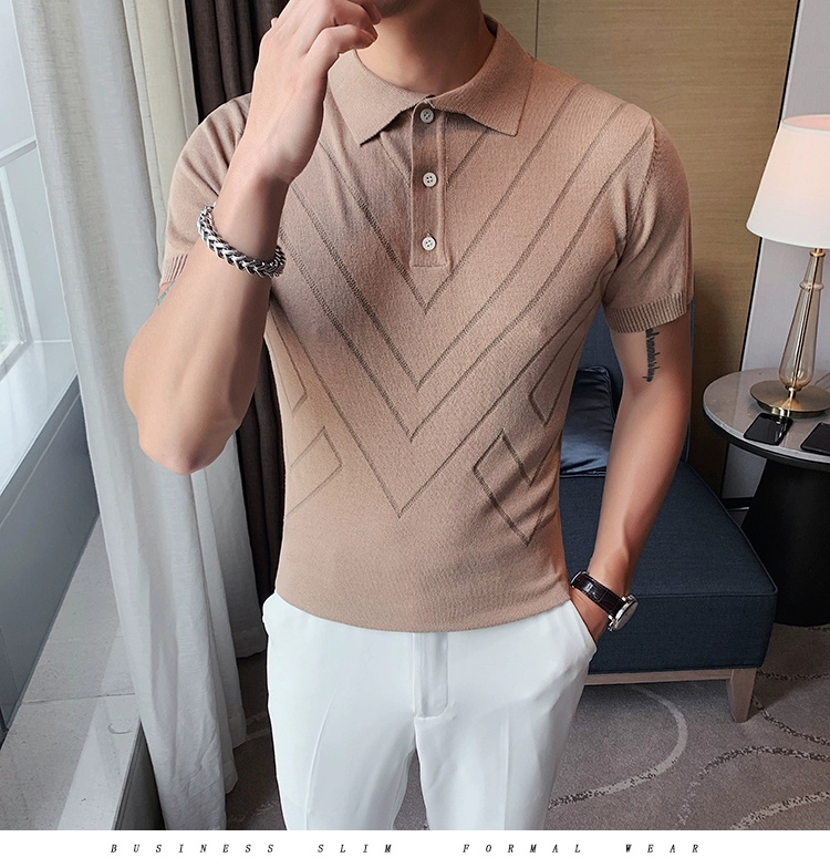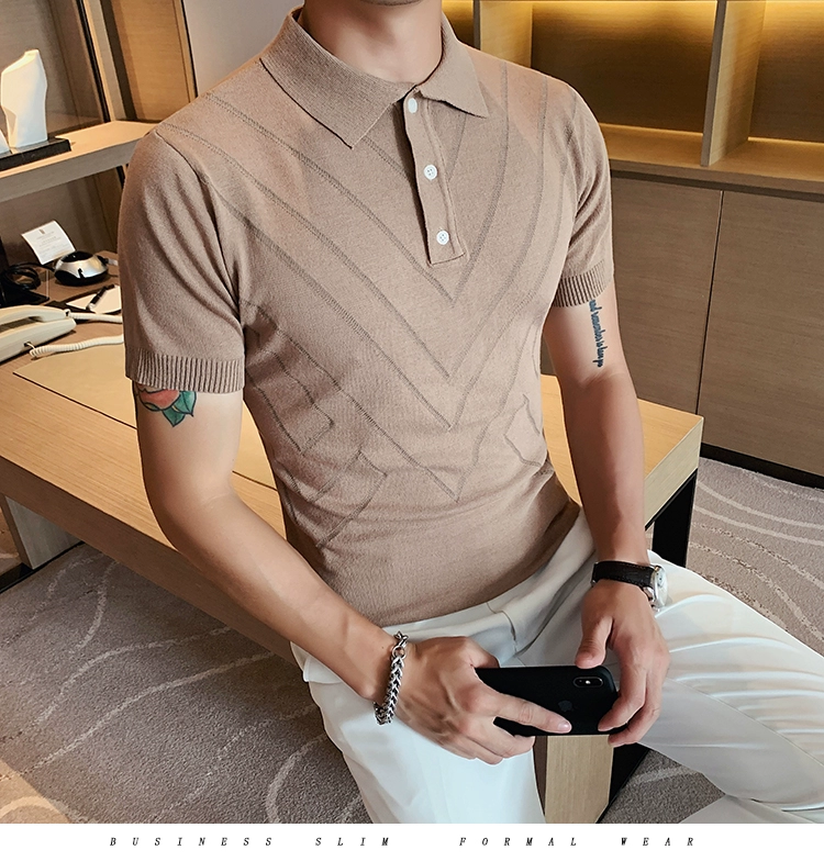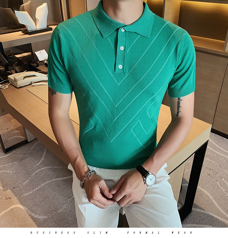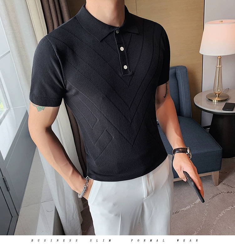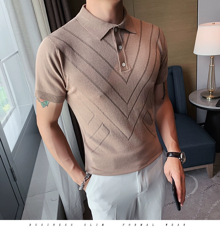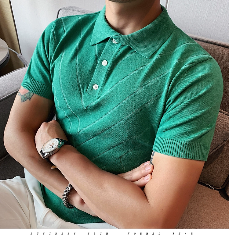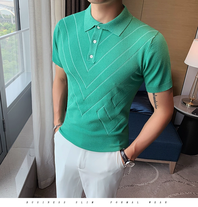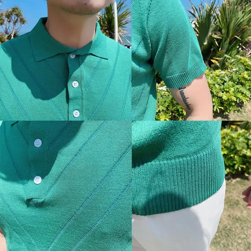 Новинка 2022, Мужская однотонная вязаная рубашка-поло в полоску из ледяного шелка, Повседневная приталенная мужская рубашка-поло в британском стиле с короткими рукавами