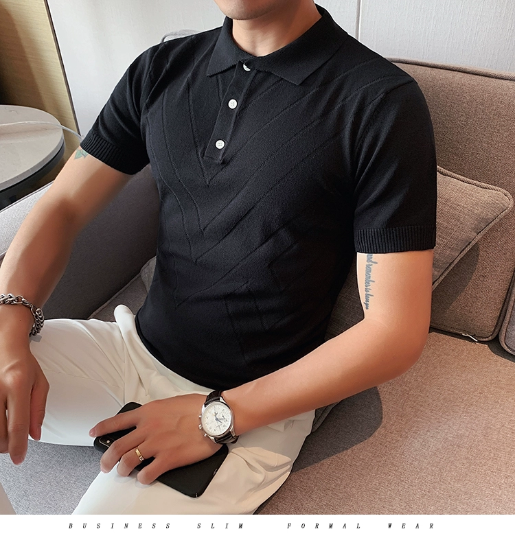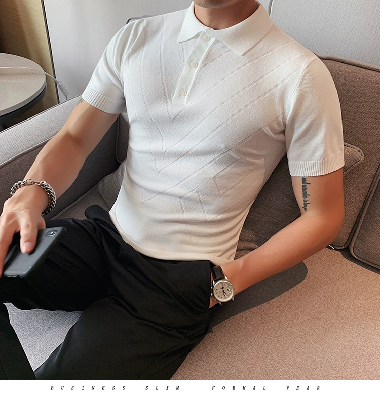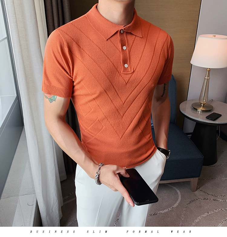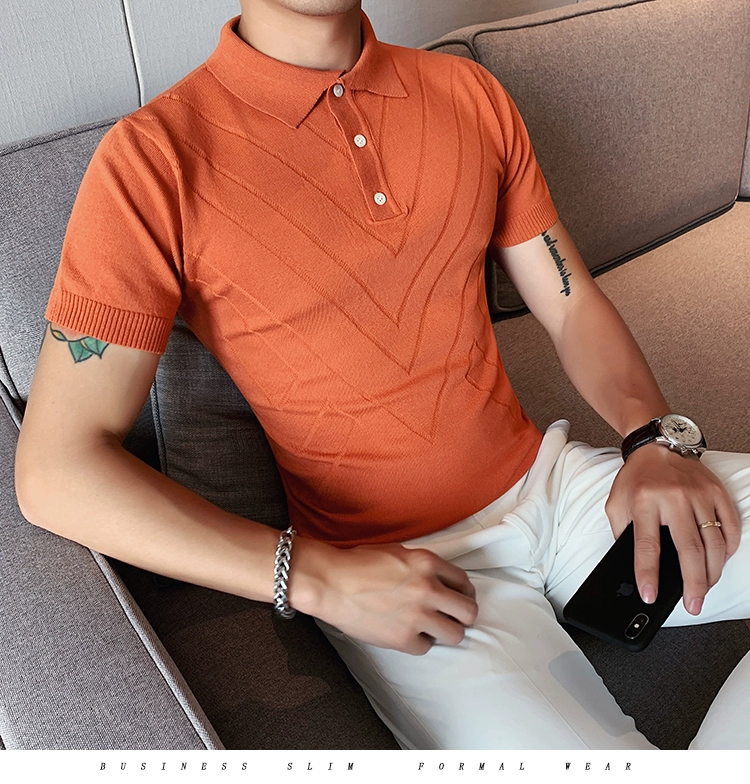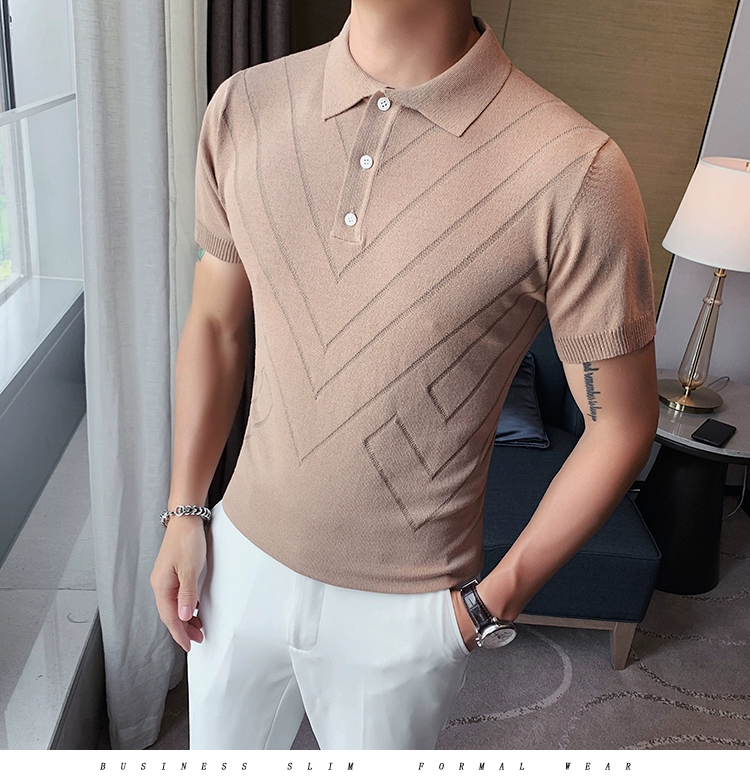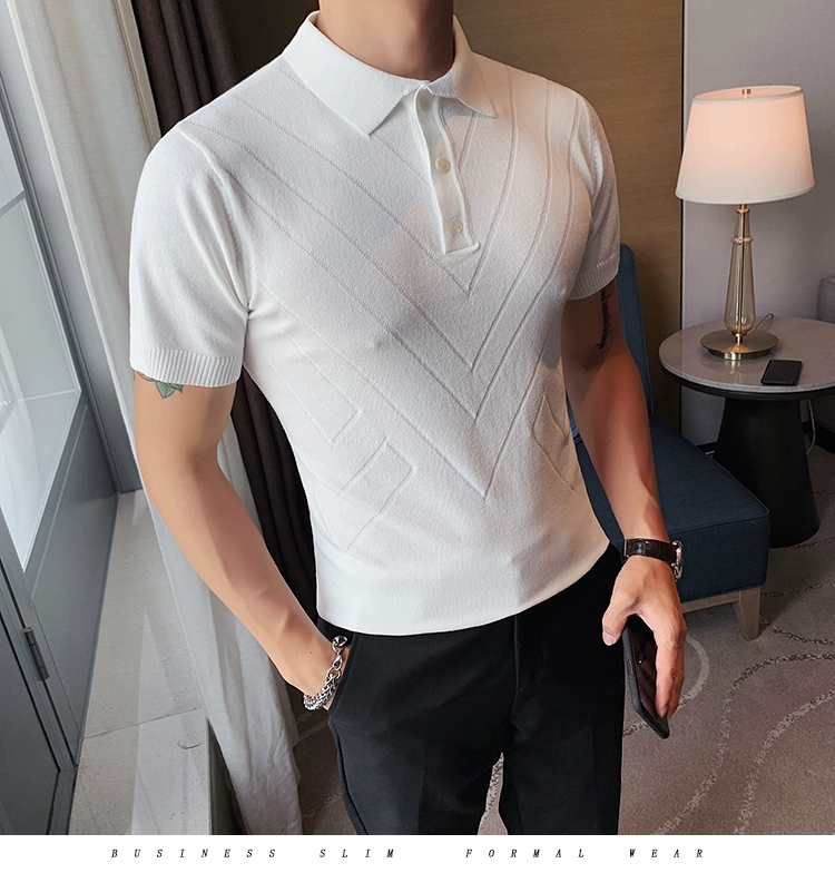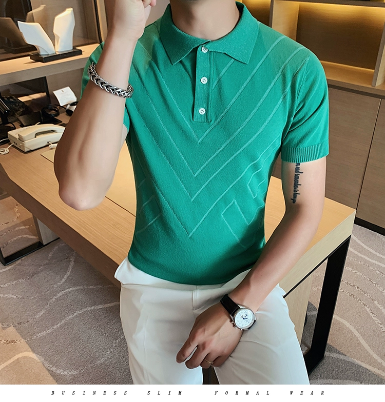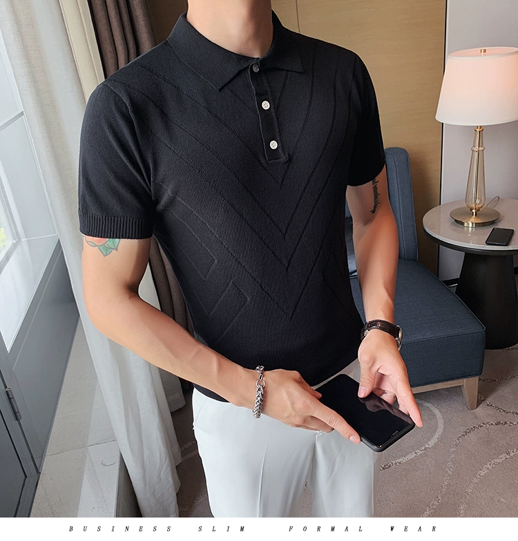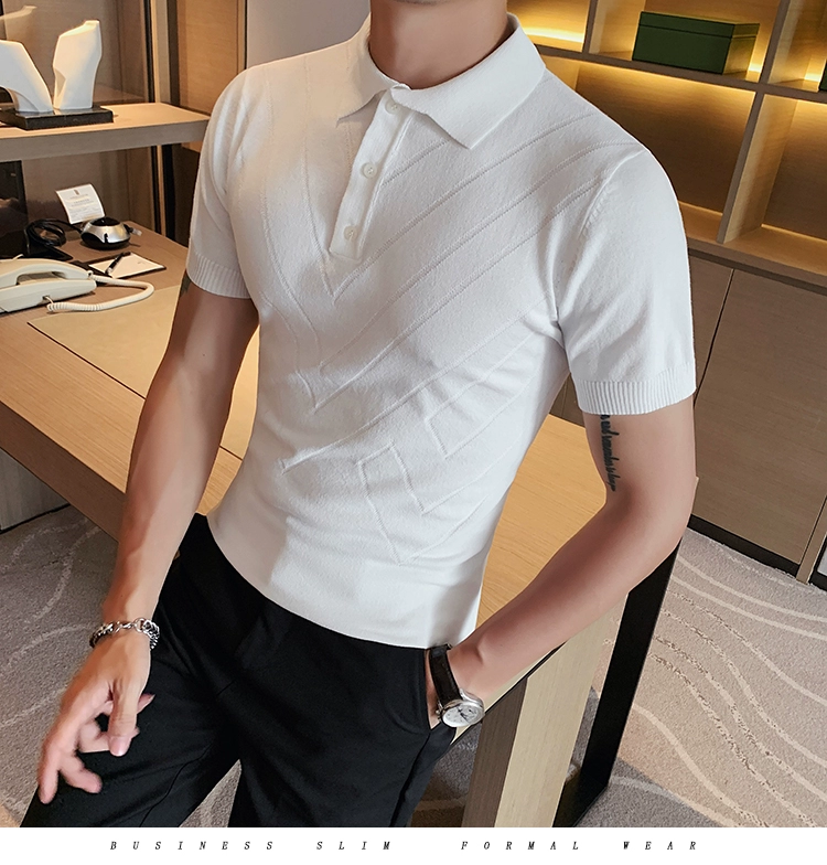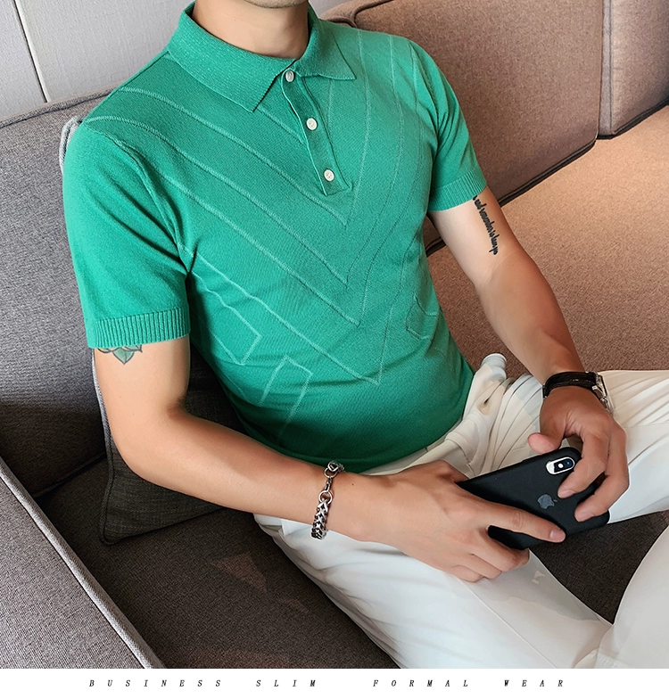 Новинка 2022, Мужская однотонная вязаная рубашка-поло в полоску из ледяного шелка, Повседневная приталенная мужская рубашка-поло в британском стиле с короткими рукавами