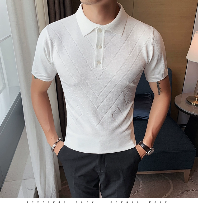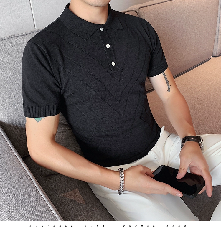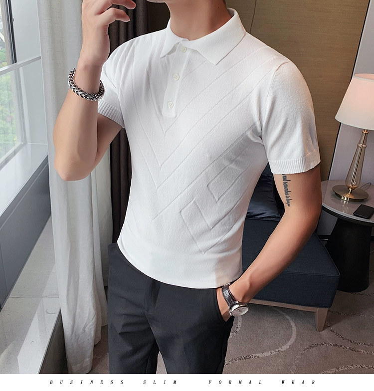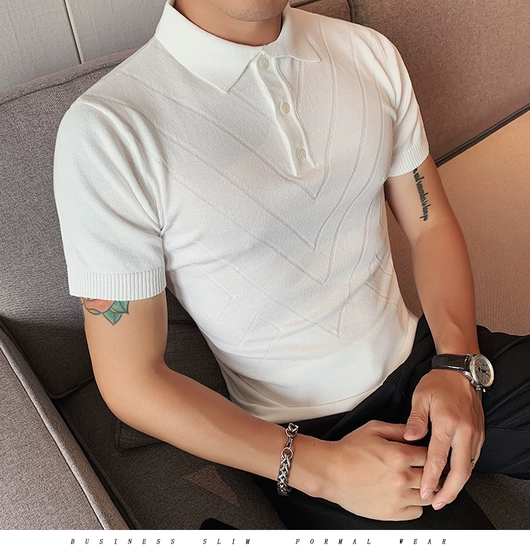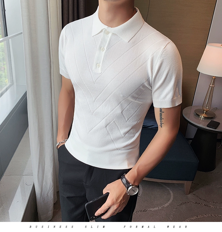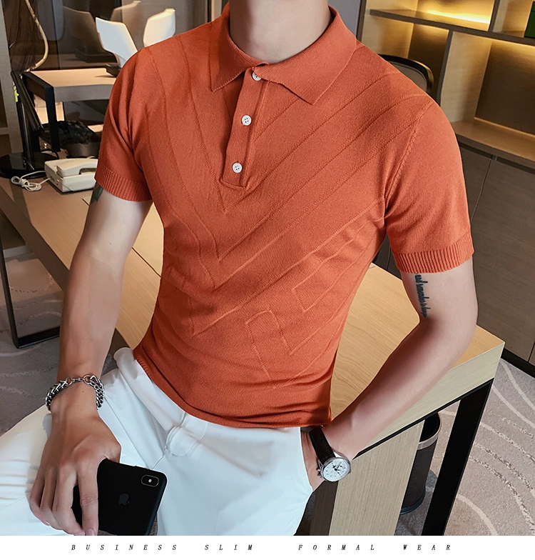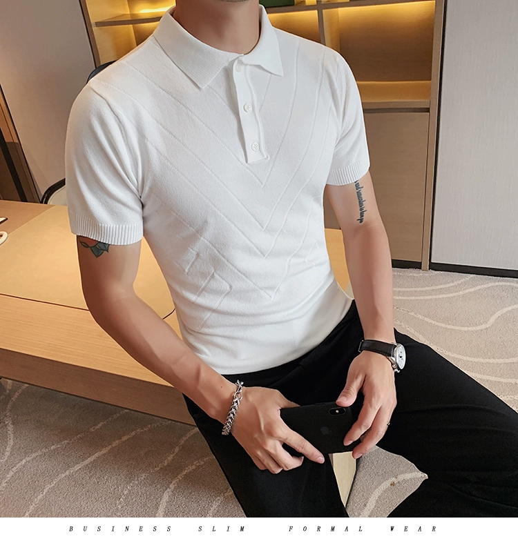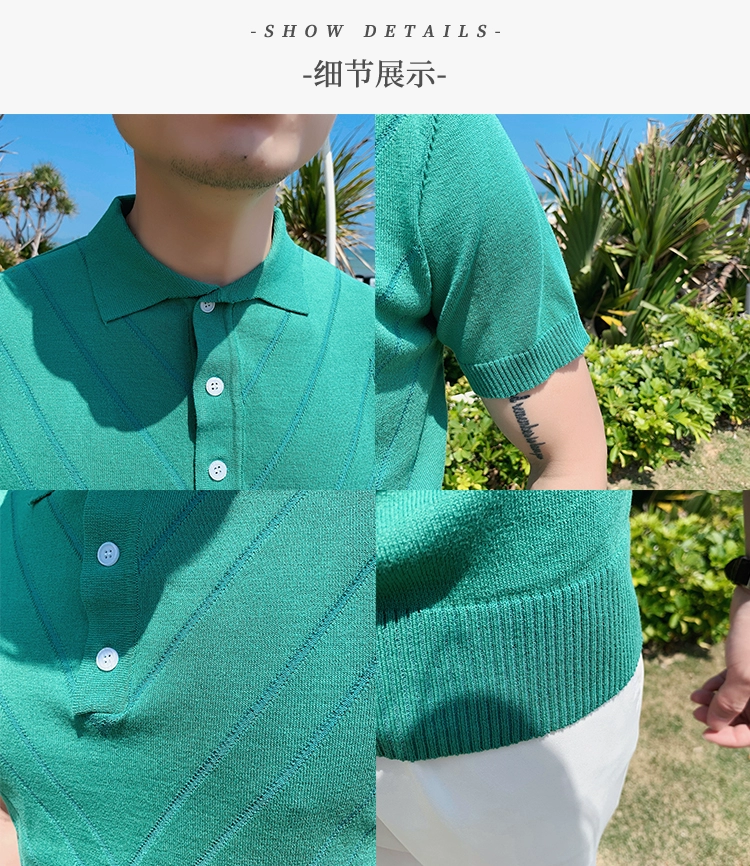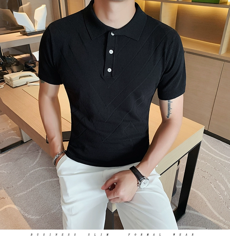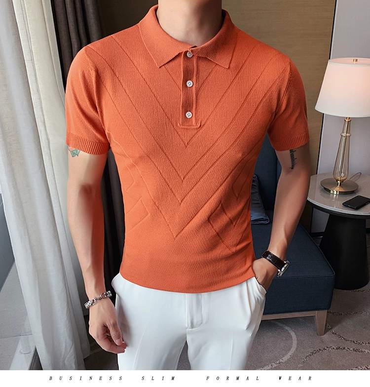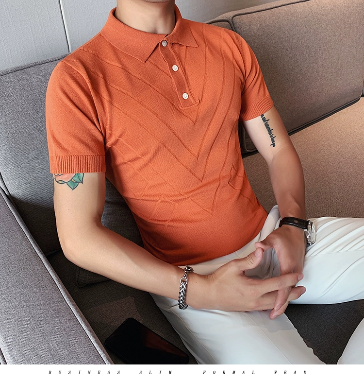 Новинка 2022, Мужская однотонная вязаная рубашка-поло в полоску из ледяного шелка, Повседневная приталенная мужская рубашка-поло в британском стиле с короткими рукавами