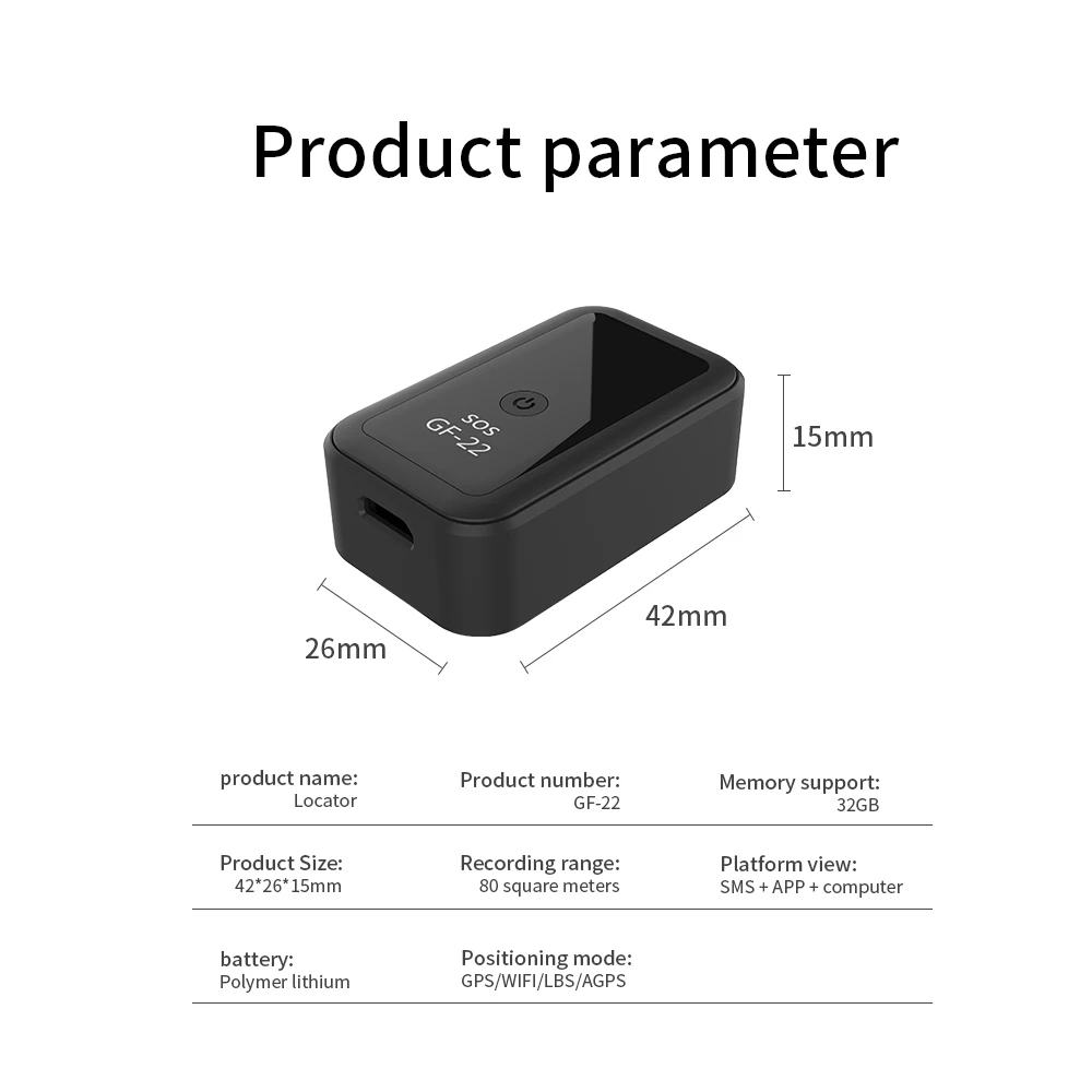 4. Точность позиционирования: 10-50 метров, поддержка памяти: TF карта 32 Гб (не входит в комплект), диапазон записи: 80 квадратных метров, вид платформы: SMS + Приложение + компьютер.