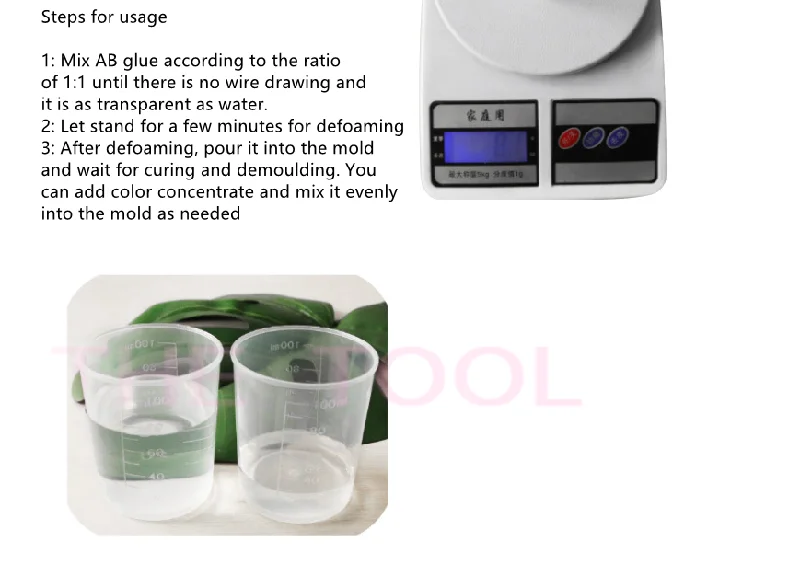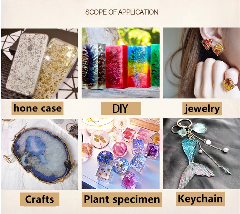 Название: эпоксидный клей ABВнешний вид: бесцветная прозрачная жидкостьСоотношение: A:B = 1:1Срок годности: 6 месяцевВремя работы: 40 минут при 25 градусах по ЦельсиюВремя отверждения: 6 часов при комнатной температуре для сушки поверхности, 18 часов для полного отвержденияСпособ хранения: проветривание, герметичность и хранение в прохладной средеХарактеристики продукта: сверхвысокая проницаемость, высокая твердость, самодепенообразование, высокий блеск, без ряби, без трещинСфера применения: подвески, картины со звездным небом, мобильный телефон ящиков, пепельницы, образцы животных и растений, кольца и др.
