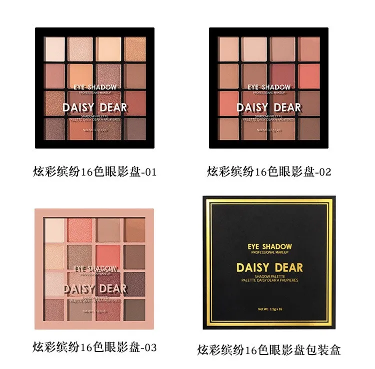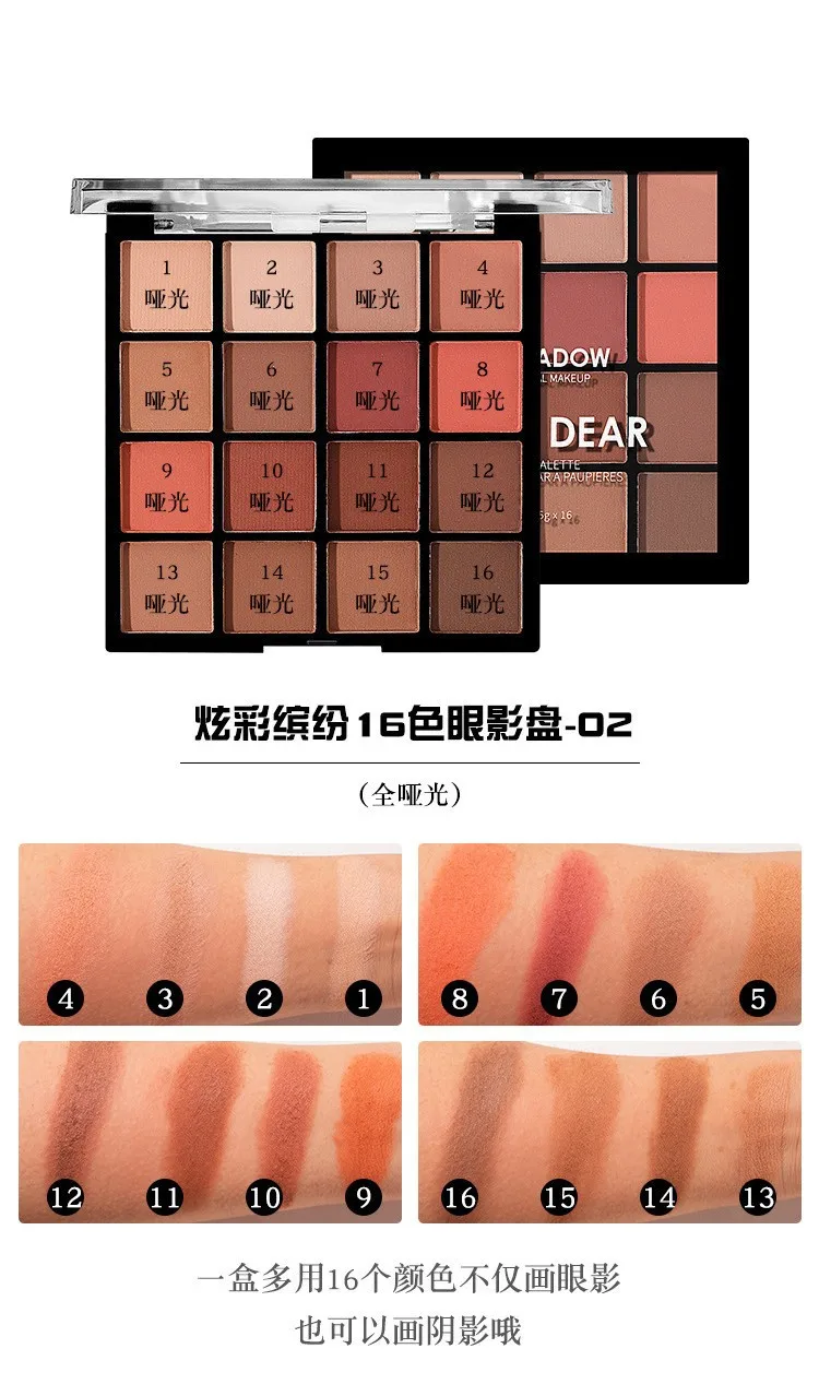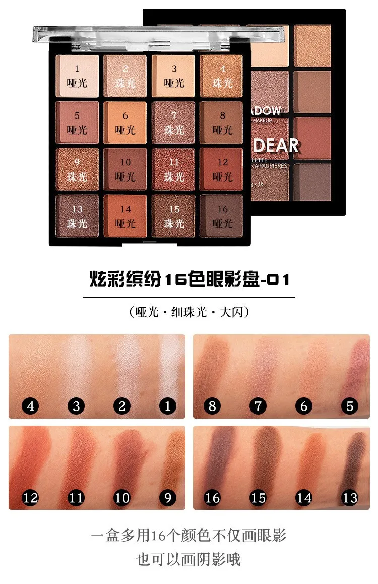 Количество штук: один элемент ингредиент: тени для век преимущество: Длительное преимущество: легко носить Преимущество: Естественное преимущество: осветление нетто WT : 16x1.5 г Размер: полный размер одного цвета/многоцветный: 16 цветов Отделка: мерцание Отделка: матовая