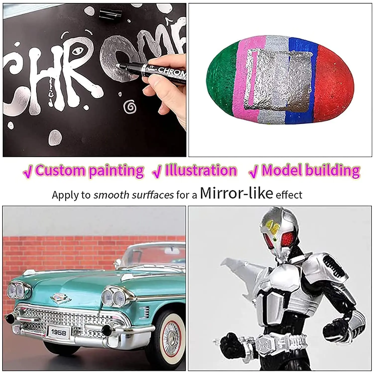Особенности:Зеркальная хромированная отделка. Этот высокопигментированный маркер на спиртовой основе создает Блестящий настоящий зеркальный эффект практически на всех гладких поверхностях, таких как пластик и стекло.Плавный поток. Разработанный с инновационным клапаном, чернила плавно протекают без остановок, протечек или кровотечения.Для практически любых гладких поверхностей. Эффективно на различных поверхностях, таких как пластик, стекло, металл, глина, пена, бумага и многое другое.Долговечные чернила. Его высокопигментная формула устойчива к царапинам, УФ-стойкая и стойкая к атмосферным воздействиям.Различные размеры. Доступны 3 размера наконечника ручки: 7 мм, 1,0 мм, 3,0 мм, чтобы удовлетворить все ваши творческие потребности.Широкое применение. Эти хромированные чернила также подходят для аэрографии. Тонкие пигменты можно распылять через пневматические пистолеты. Технические характеристикиНаконечник ручки: 0,7 мм, 1,0 мм, 3,0 ммРазмер: 14,2 см x 1,6 смВ комплект входит:1 x жидкое зеркало SilverArt хромированный маркер