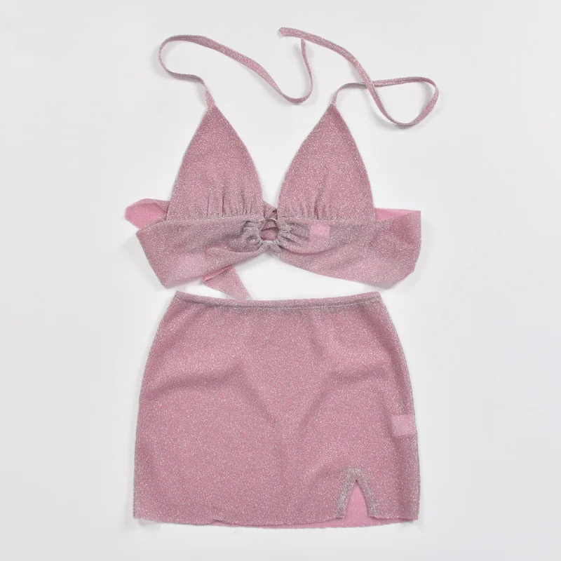 Сексуальное Сетчатое прозрачное пляжное платье с открытой спиной для вечеринки, женский летний комплект из двух предметов 2021, короткий топ с лямкой на шее и искусственные костюмы