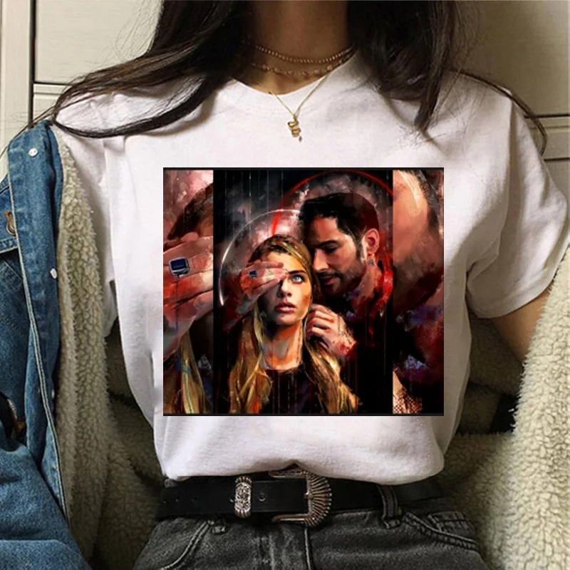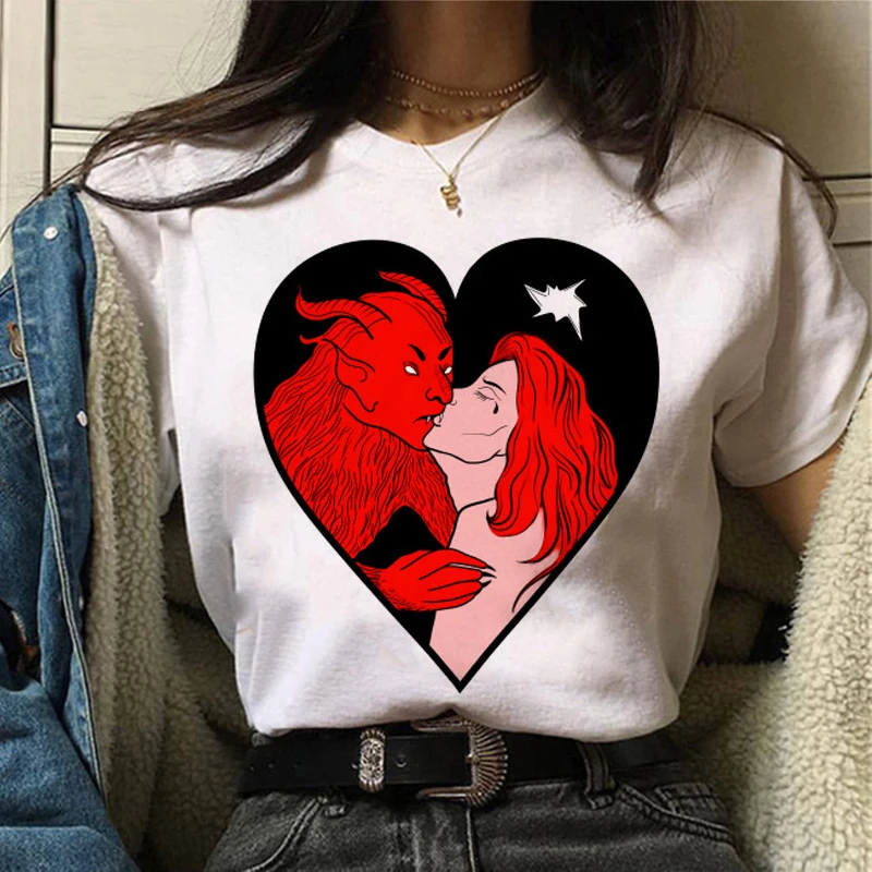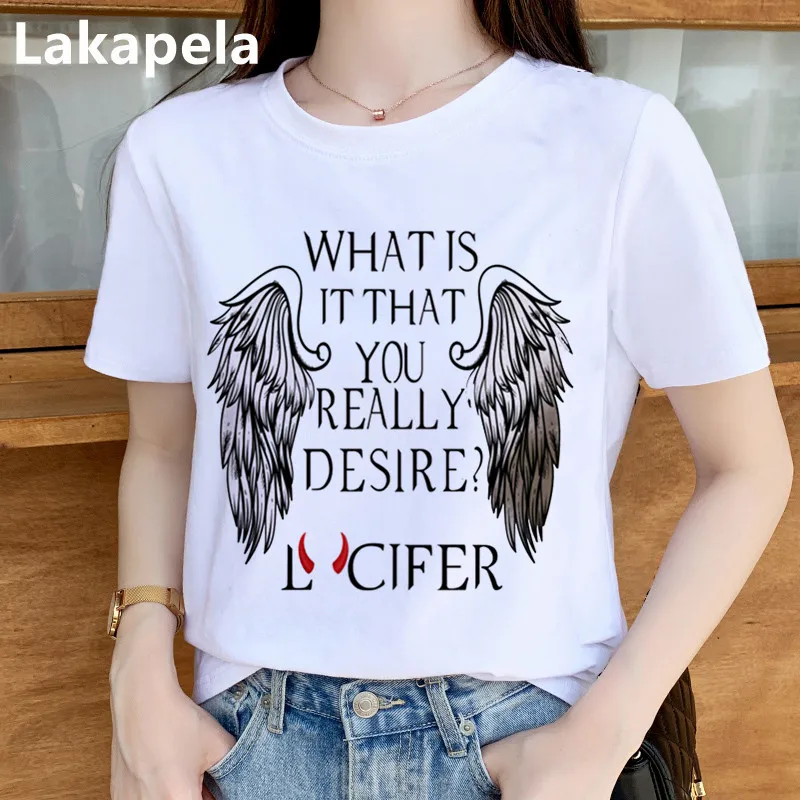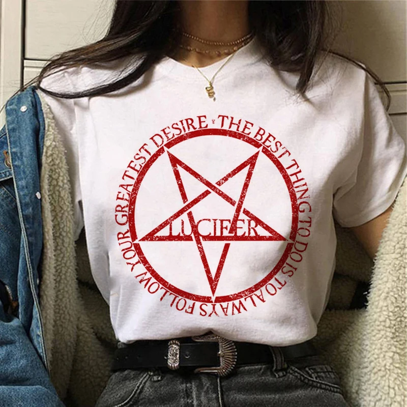 Женская футболка с принтом дьявола Люцифера Наш лорд, летняя модная футболка в стиле Харадзюку, топы, базовая белая футболка с круглым вырезом, короткие женские футболки