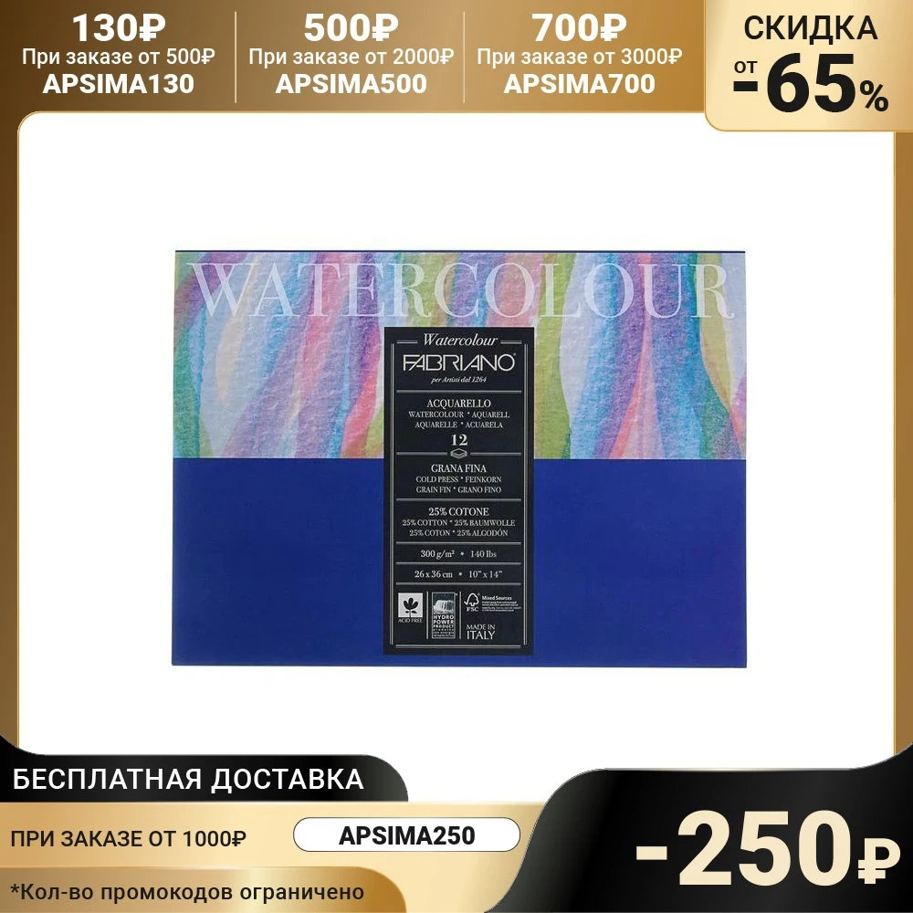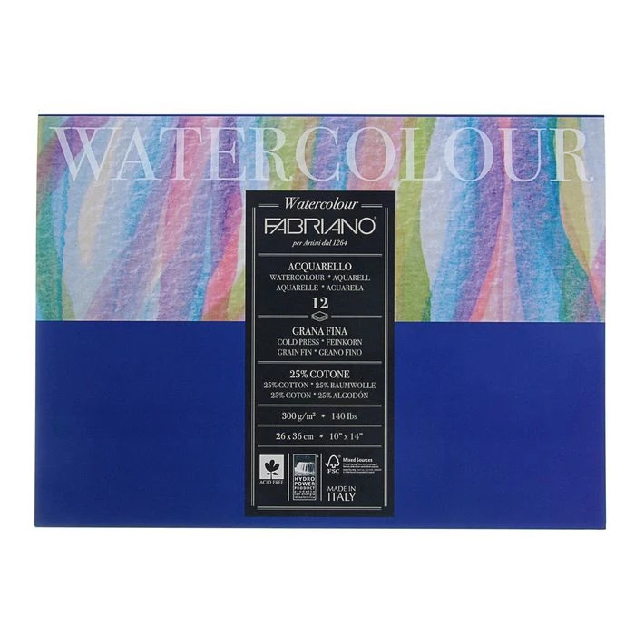 Альбом для Акварели, хлопок 25%, 260 х 360 мм, В4, Fabriano Watercolour, 12 листов, 300 гм, склейка, Grain Fin (среднее зерно)