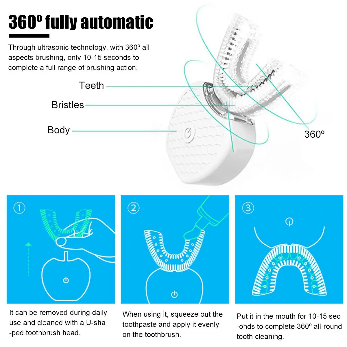 Водонепроницаемая силиконовая U-образная ультразвуковая зубная щетка, USB перезаряжаемая автоматическая электрическая зубная щетка, 4 режима, щетка для чистки полости рта