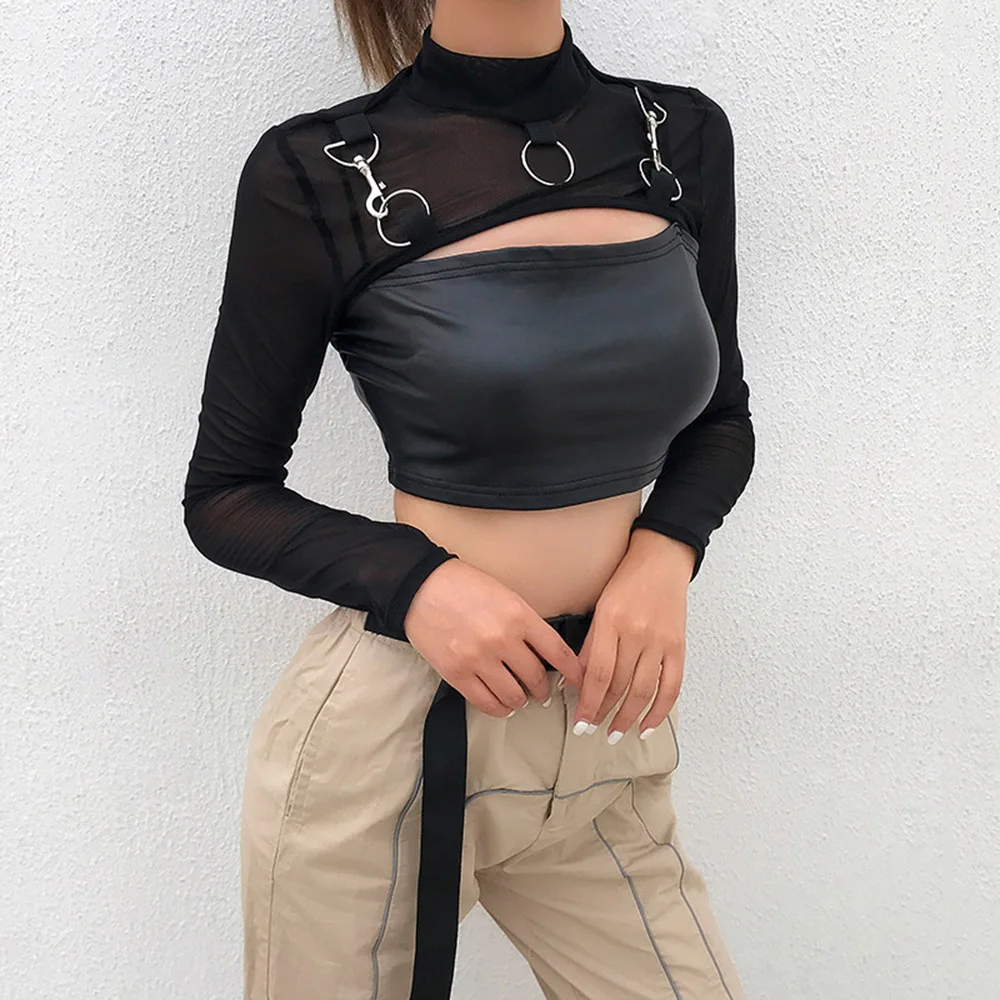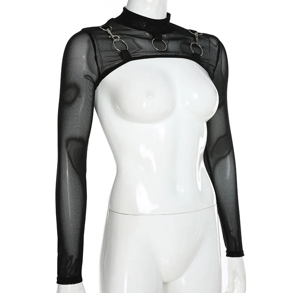 Rosetic 2020 Готический сексуальный короткий топ, прозрачный сетчатый топ, футболка с длинным рукавом, Женская водолазка с металлическим воротником, футболки в стиле панк, уличная футболка
