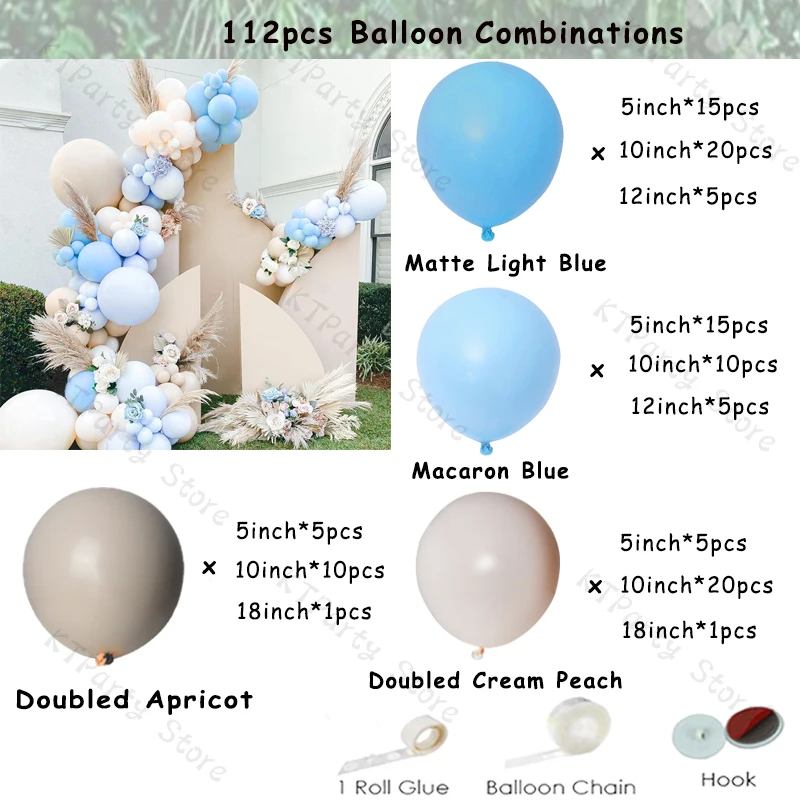 112Шт (10 футов) воздушный шар Упаковочный лист:Синий Макарон (5 дюймов * 15 шт., 10 дюймов * 20 шт., 12 дюймов * 5 шт.)Синий матовый светильник (5 дюймов * 15 шт., 10 дюймов * 10 шт., 12 дюймов * 5 шт.)Крем-персик в два раза (5 дюймов * 5 шт., 10 дюймов * 20 шт., 18 дюймов * 1 шт.)Абрикосовый (5 дюймов * 5 шт., 10 дюймов * 10 шт., 18 дюймов * 1 шт.)Бесплатно: рулонный клей * 1(100 шт)Воздушная цепь * 1(5 м)Крючок * 3