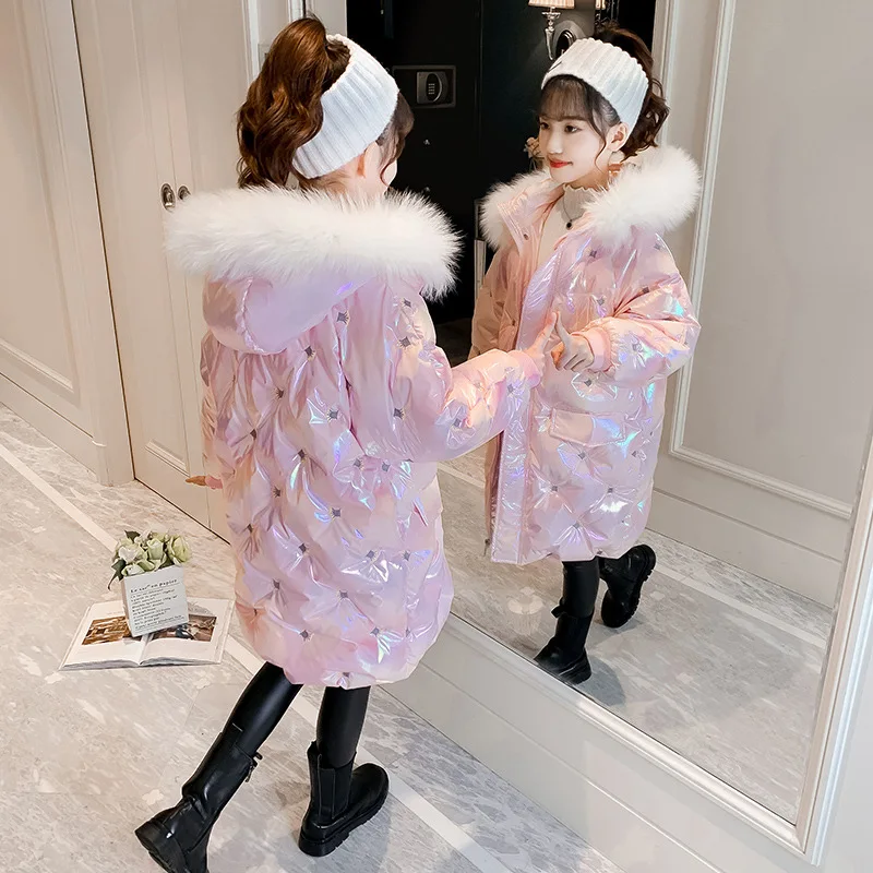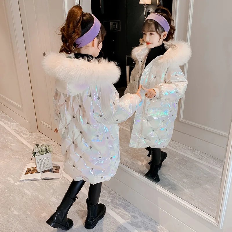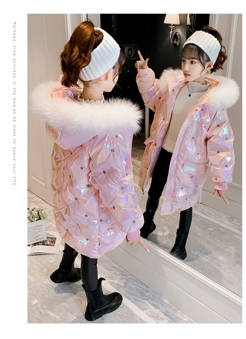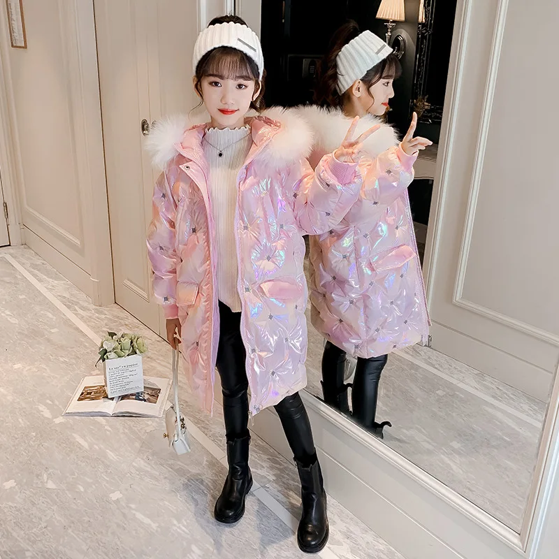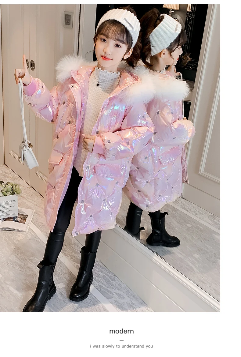 Зимнее хлопковое пальто с капюшоном и меховым воротником для девочек, детская теплая зимняя куртка средней длины с подкладкой, детская модная водонепроницаемая верхняя одежда TZ788