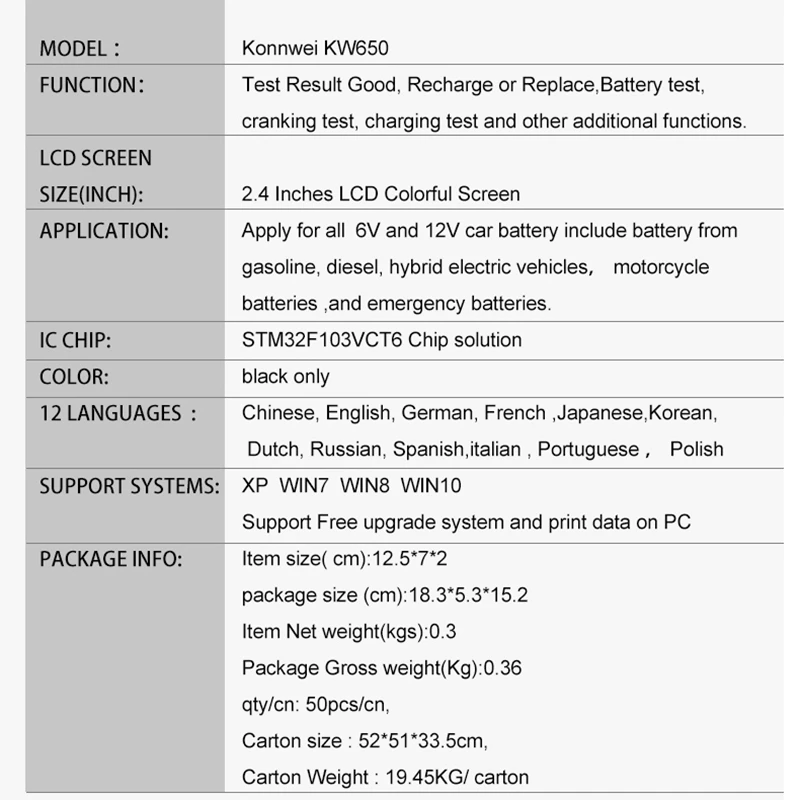 С цветным экраном. Импортный чип STM32103VCT6. Результаты тестирования графического аккумулятора. U-I сигнал также может быть распечатан.Хранение и обзор результатов тестирования. Отчеты об аккумуляторах могут быть распечатаны на ПК. Поддержка бесплатного обновления в режиме онлайн. (http://www.konnwei.com)Поддерживает регулярные Затопленные батареи, AGM плоские пластинчатые батареи, AGM спиральные батареи, гель и EFB батареи в будущем после обновления.Стандарт батареи: CCA:100-2000/BCI:100-2000/CA:100-2000/MCA:100-2000/JIS:26A17-245H52/DIN:100-1400/IEC:100-1400/EN:100-2000/SAE:100-2000.Работа на батарее 6- 16 В включает батарею мотоцикла, бензина, сырой нефти, гибридных электромобилей и аварийные аккумуляторы в комплекте.Не требуется никаких внутренних батарейВход Напряжение диапазон: 6V-16VРабочая температура: 0 ℃-50 ℃Температура хранения: -20 ℃-70 ℃Материал: АБС-пластикЦвет: черныйПосылка:1 х считыватель штрих-кодов1 х USB кабель1 нейлоновый рукав1 х руководство на английском языкеТолько вышеуказанная посылка, другие товары не включены.Примечание: светильник и различные дисплеи могут привести к тому, что цвет товара на картинке немного отличается от реального. Допускается погрешность в измерениях +/- 1-3 см.
