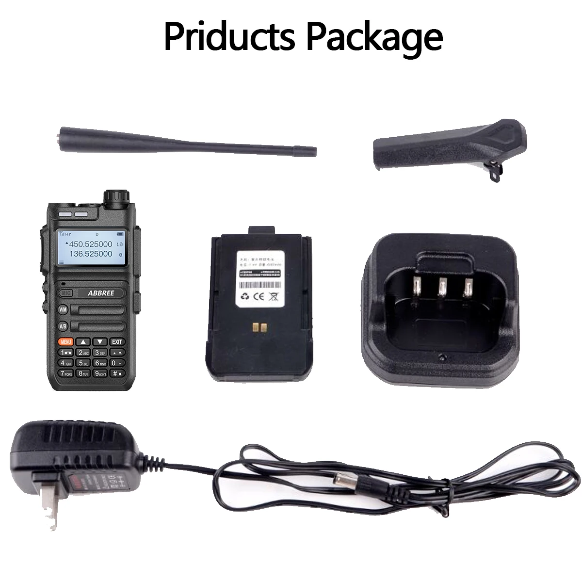 2 x walkie talkie2 батареи2 x Антенна2 x Зажим для ремняАдаптер-2 шт.2 х настольного зарядного устройства2 x Руководство пользователя