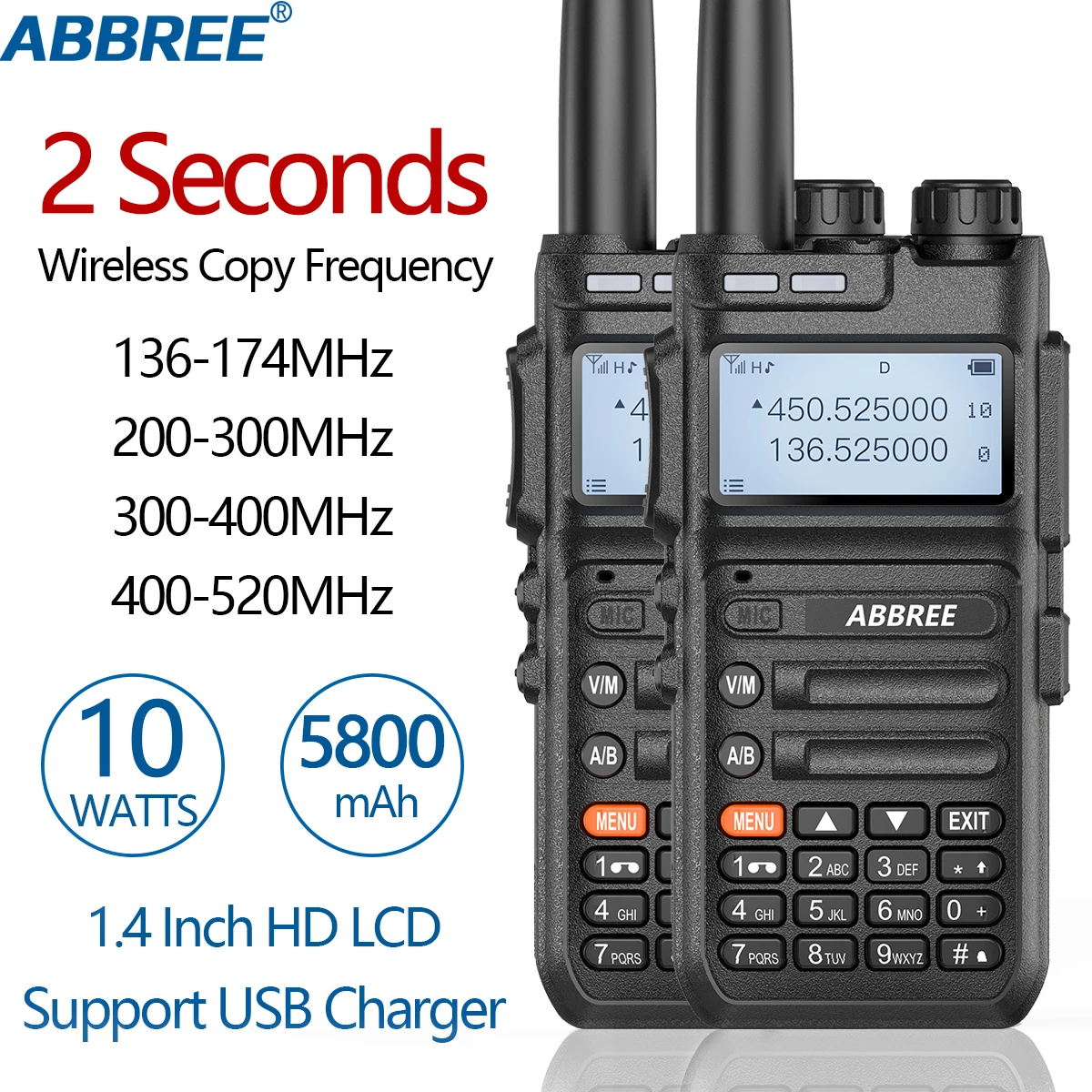 2 шт. ABBREE AR-F5 автоматический Беспроводной Копировать частоты иди и болтай Walkie Talkie иди и 136-520 МГц, полный диапазон частоты радио сканирования большой ЖК-дисплей Дисплей