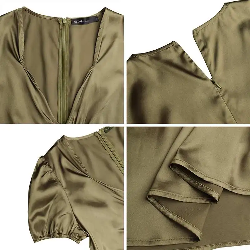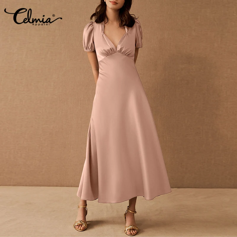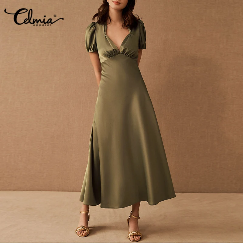Летний сарафан Celmia, пикантное атласное женское длинное платье макси с V-образным вырезом, модное повседневное свободное Плиссированное вечернее платье с пышными короткими рукавами