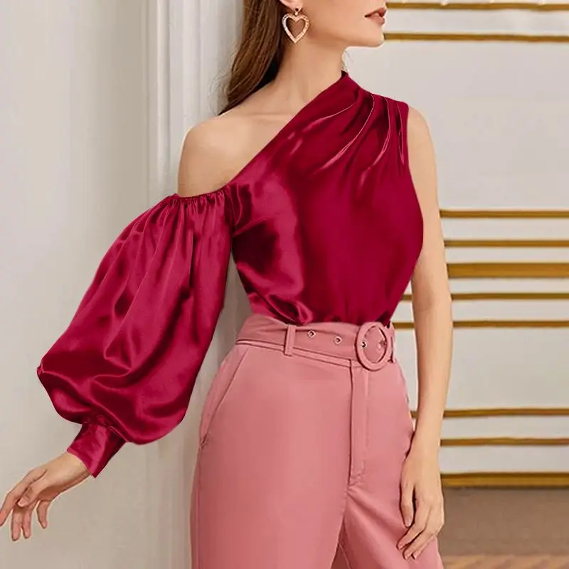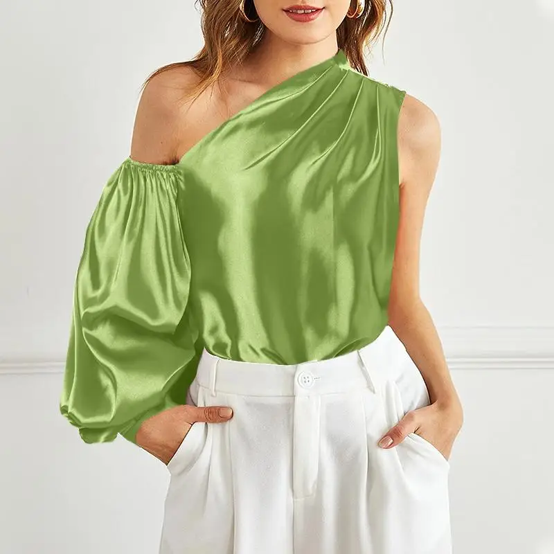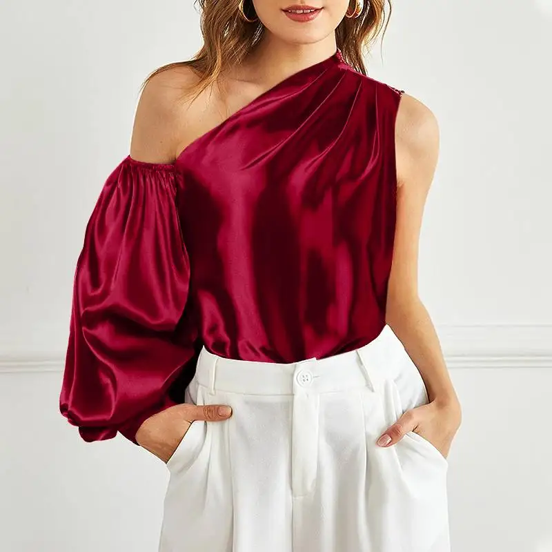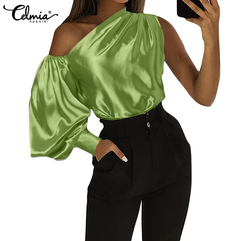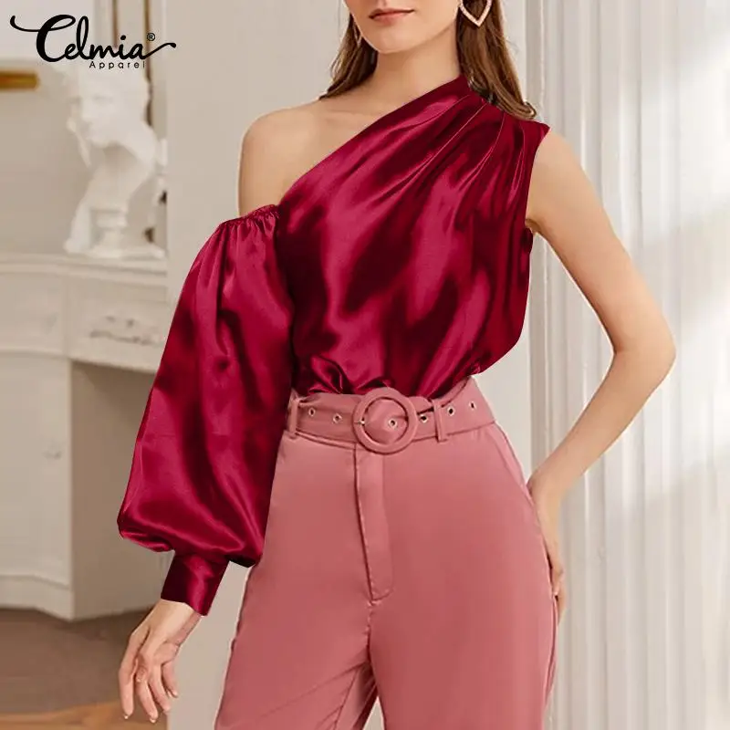 Celmia 2022 Модные женские атласные топы на одно плечо, элегантная летняя блузка с рукавами-фонариками, Асимметричная Повседневная рубашка, уличная одежда