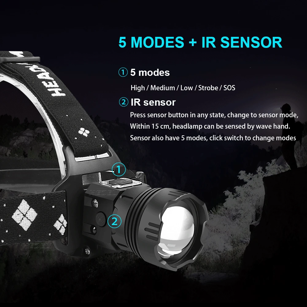 Нажмите кнопку датчика в любом состоянии, измените на режимы датчика, в пределах 15 см, налобный фонарь может быть обнаружен волновой рукой. Датчик также имеет 5 режимов, нажмите переключатель для изменения режимов.