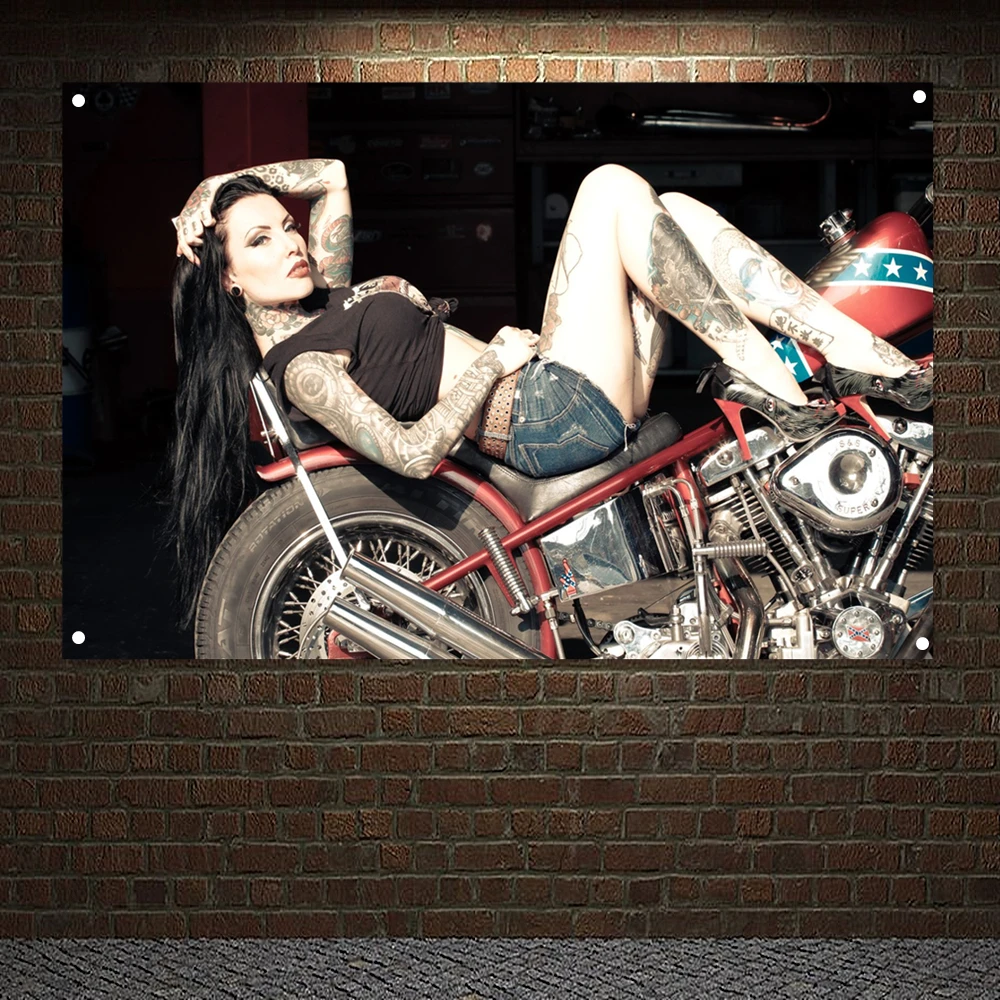Мотоциклетный постер с откидной таблицей, домашний декор, мото-леди с татуировкой, баннером, флагом, настенная подвеска, сексуальная девушка, гобелен с художественным рисунком телесного цвета C3
