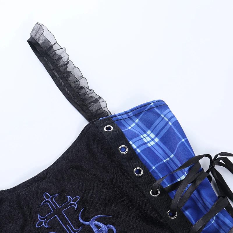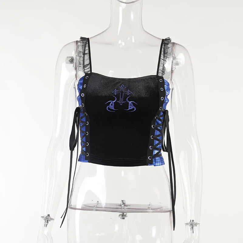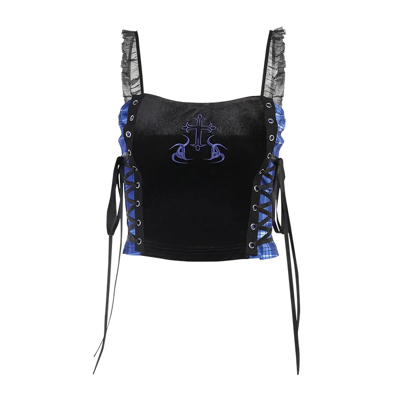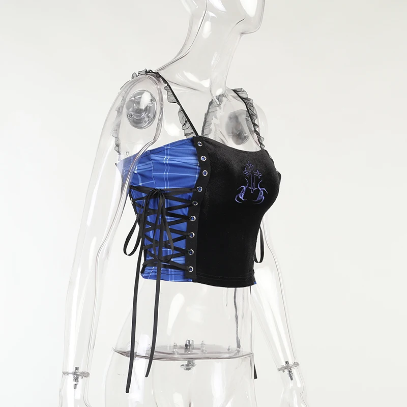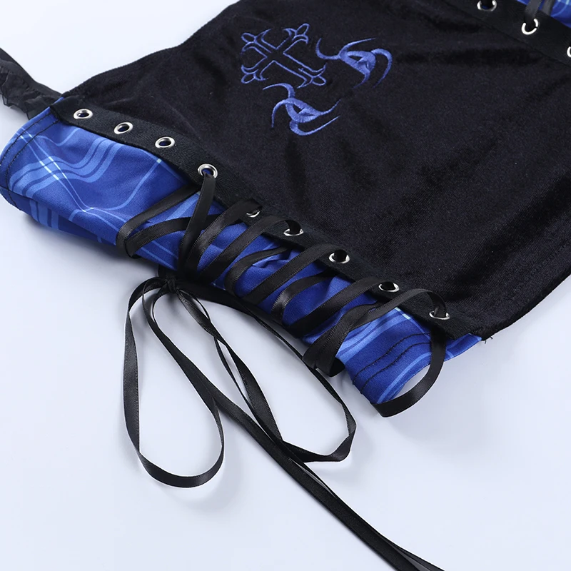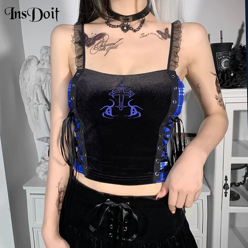 Женский винтажный топ на шнуровке InsDoit, синий топ без рукавов с вышивкой и открытой спиной в готическом стиле, летний укороченный топ в стиле пэчворк,
