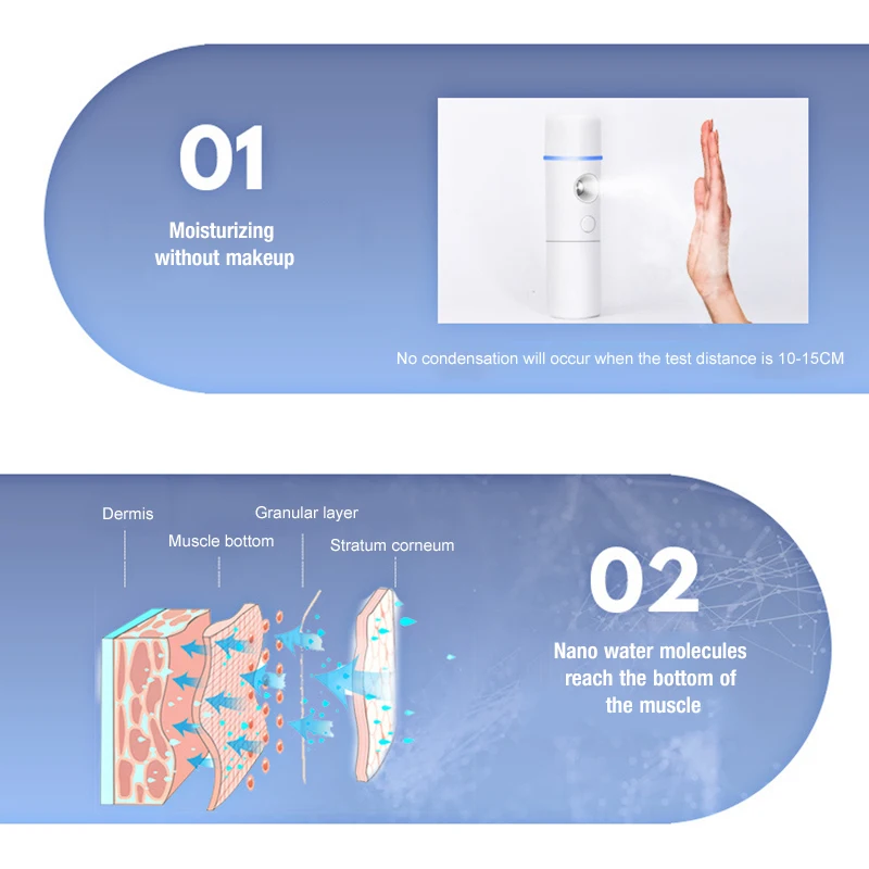 3. Увлажнение без макияжа, ежедневный уход за кожей (расстояние от распылителя 10-15 см не будет конденсировать капли воды)