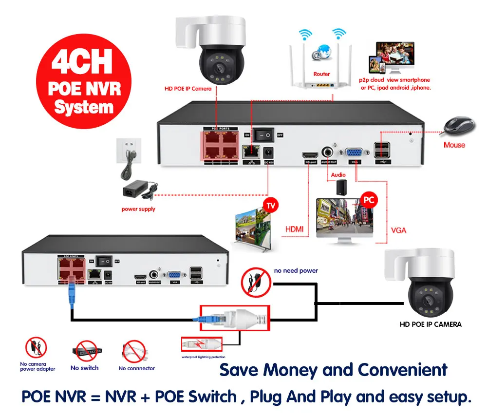 Нет дополнительных кабелей питания или адаптеров, просто подключив ip-камеру к NVR с помощью одного кабеля, вы можете легко завершить установку без знания о компьютере или сети и начать наслаждаться супер простым мониторингом среди вашего смартфона, планшета или ПК.