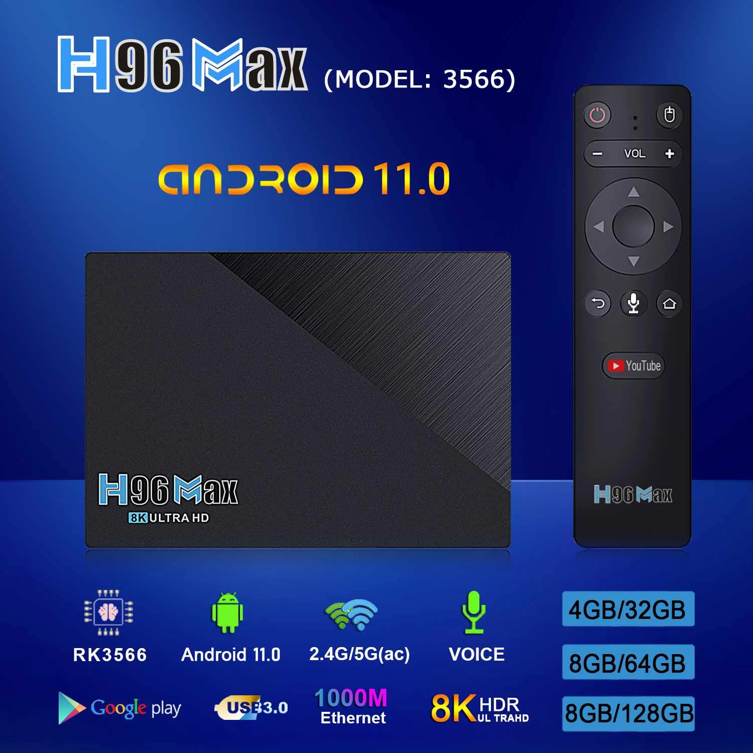 H96 MAX RK3566 Смарт ТВ коробка Android 11,0 8 Гб DDR3 64 Гб ТВ коробка 8K HDR для геймера 1000M LAN H.265 VP9 4K декодер ИК Управление OTT