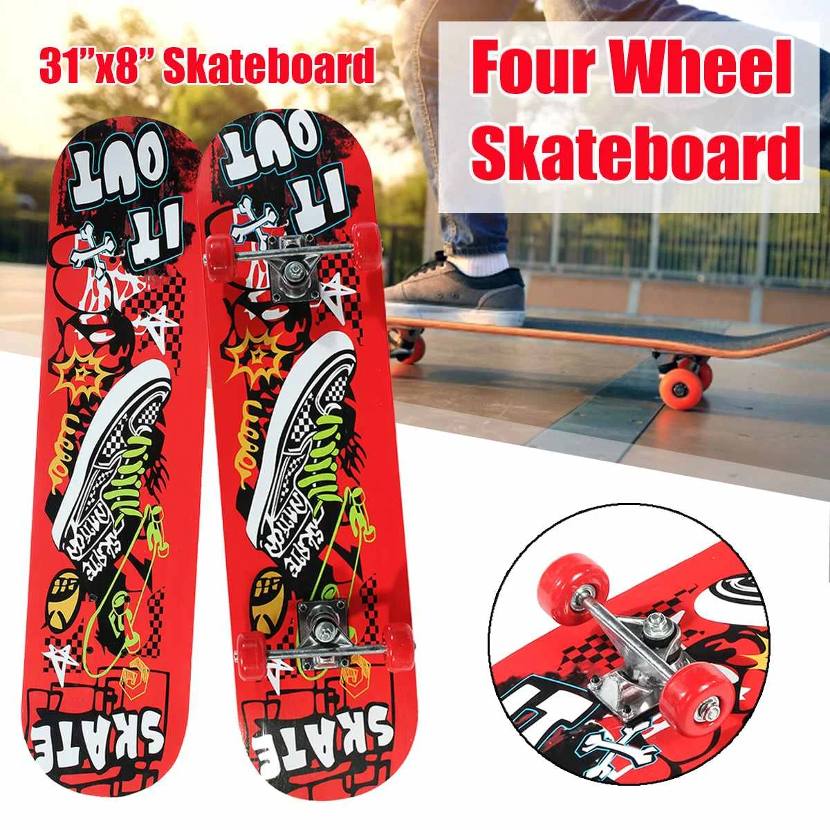 Особенности:-- Легко ездить: полный скейтборд может не только обеспечить большую стабильность и безопасность для пользователей, но и держать обе ноги на нем. Сильная ударопрочность, которая подходит для мальчиков и девочек.-- Превосходное управление: Эта двойная колода обеспечивает в целом очень мягкую Вогнутую, в то время как средние колесные колодцы обеспечивают превосходный контроль во время езды или выполнения трюков. Этот скейтборд идеально подходит для начинающих и профессионалов, которые делают базовые трюки и другие трюки, что позволяет им легко учиться и наслаждаться весельем.-Плавная скорость езды: подходит для катания на коньках на улице, скейт-парках, пандусах, бассейнах и других гладких поверхностях или даже грубой земле, противоскользящая для безопасности.-- Легко остановить: когда вы хотите остановить, просто положите одну из ваших ног на землю, чтобы остановить его. Или вы можете наклонять свое тело в обратном направлении, чтобы замедлить скорость, а затем остановить свой скейтборд. Хороший подарок.